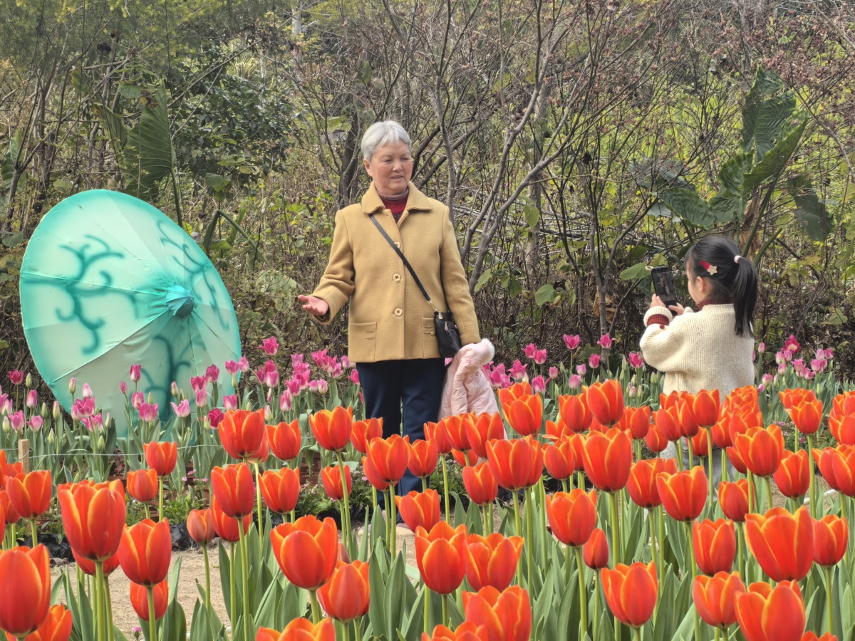 市民在花海中拍照留念。记者 唐晓燕 摄 在訾洲公园诗画广场和大草坪,各色郁金香把这里变成五彩花海,红色、白色、粉色、紫色、黄色……在阳光照耀下,郁金香绚丽夺目,营造出热烈的春节氛围。