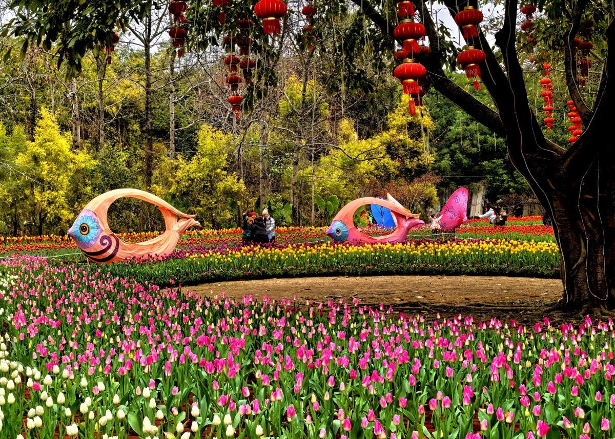 鱼花灯融入郁金香花海。李腾钊 摄 据介绍,自2011年起,桂林市每年春节期间都要举办新春郁金香花展,“桂林过年,訾洲开花”已成为桂林新年俗。 |