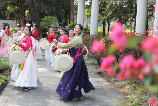 这样的文化交融在春节期间的北海随处可见。在长青公园,朝鲜族舞蹈教师杨玉君正指导着多民族学员排练长鼓舞。数十名北海市民和来自天南海北的旅居者,身着色彩艳丽的朝鲜族传统服饰,在杨玉君的带领下跳起长鼓舞。欢快的鼓点伴着轻盈的脚步,鲜艳的长裙在花丛中旋转,美不胜收。