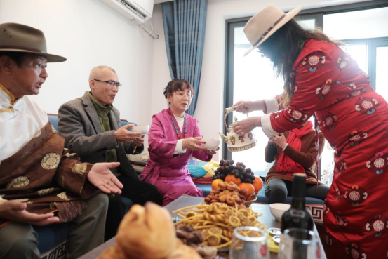 今年是青海退休干部尕藏加在北海度过的第6个春节,在北海的这些年他结识了不少本地朋友,春节期间他邀请了一些本地朋友上门体验藏族年俗。朋友们登门时,银碗盛满青稞酒,热腾腾的藏式包子、牦牛肉也上了桌,尕藏加一边拌糌粑,一边招呼朋友。家中飘溢着浓郁奶香,妻子英措忙着煮奶茶,珐琅彩搪瓷茶壶咕咕地往外冒着热气,客厅的茶几上摆满了藏族同胞过年时的传统食品,馓子、油果子、焜锅馍馍等堆得满满的、高高的。尕藏加说,这是藏族同胞过年的习俗,寓意生活富足圆满。大家围坐一团,边吃边聊,英措带着女同胞在客厅跳起欢乐的锅庄舞,喜欢填词作曲的尕藏加拿出了咏唱家乡和北海的新作品《山海情》,旋律伴着锅庄舞步,将雪域高原的豪迈注入南国暖冬。