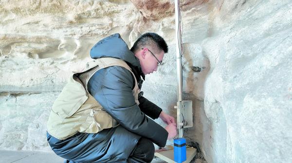 “这个窟的东南角岩石较为脆弱,需要重点检查。”仔细查看可能存在隐患的点位,扫掉监测仪器表面的落雪,重新安置垂坠的零件……申杲熟练地对窟内环境与仪器状态进行检查与调整。在更换完3号窟内监测仪器的电池后,申杲结束了巡查工作。