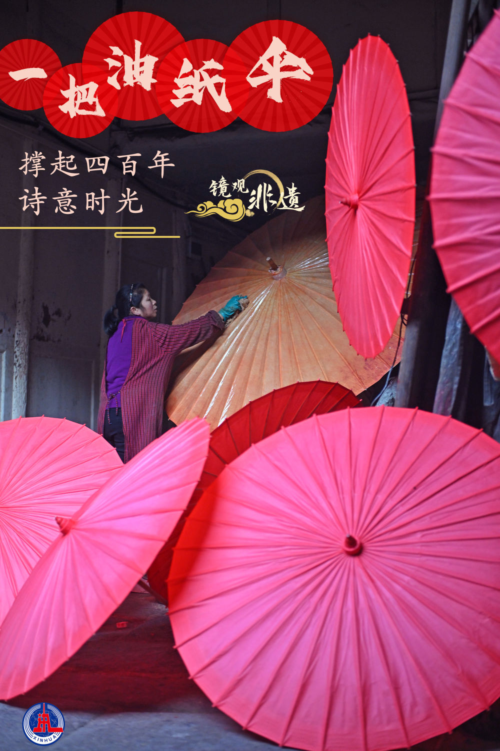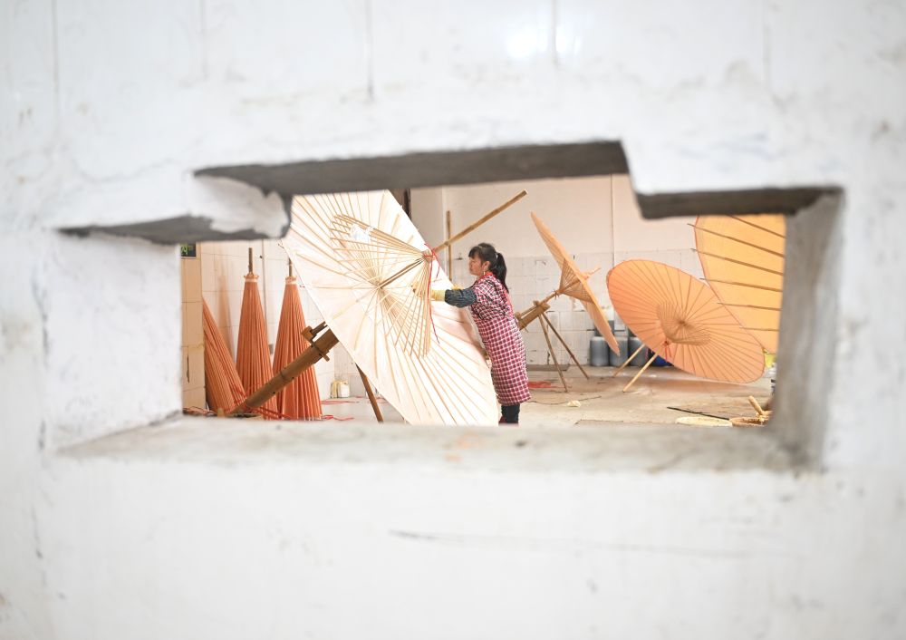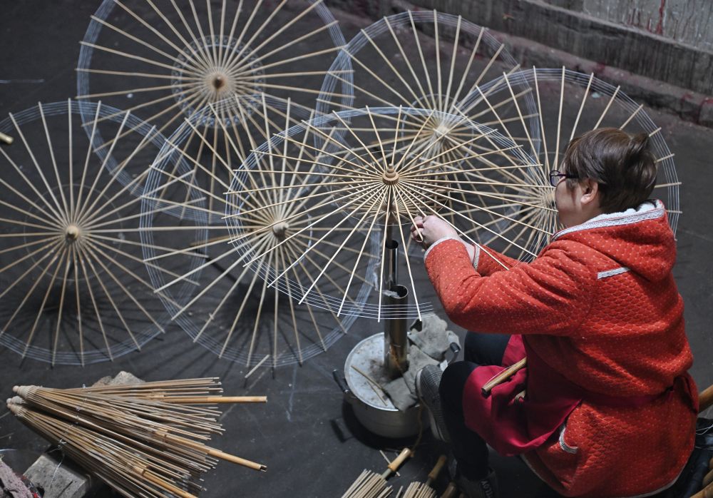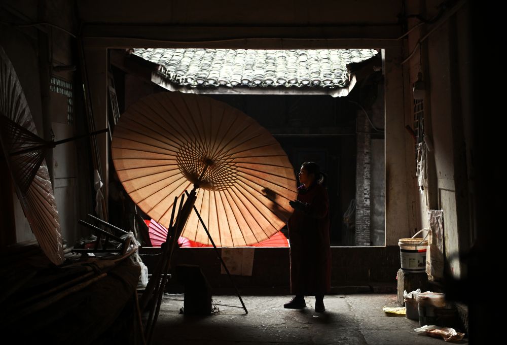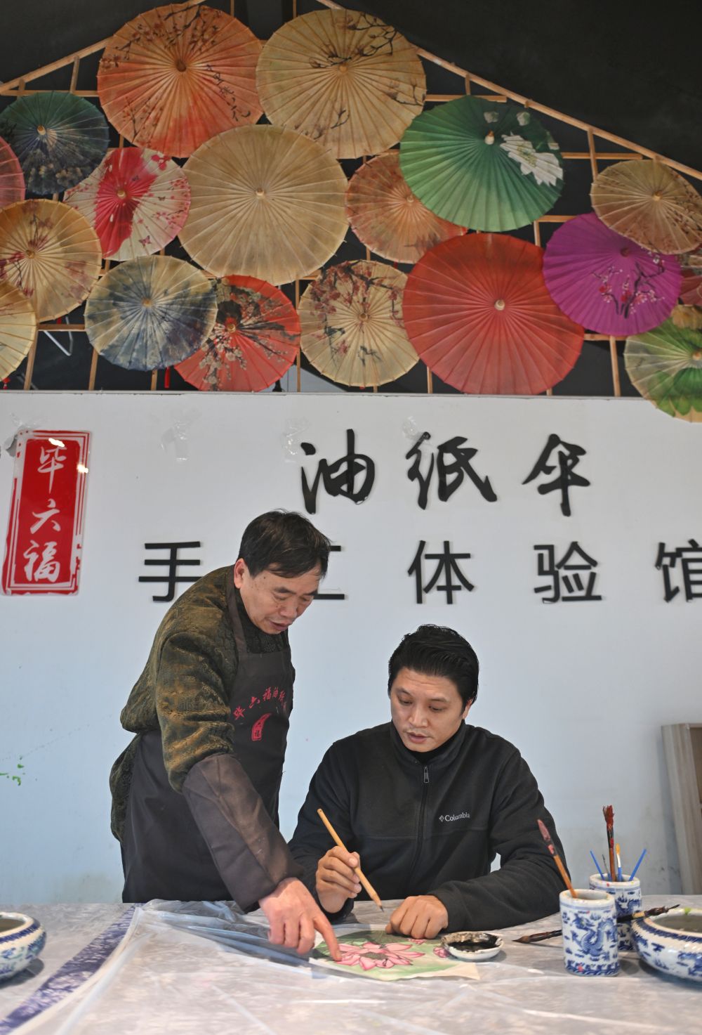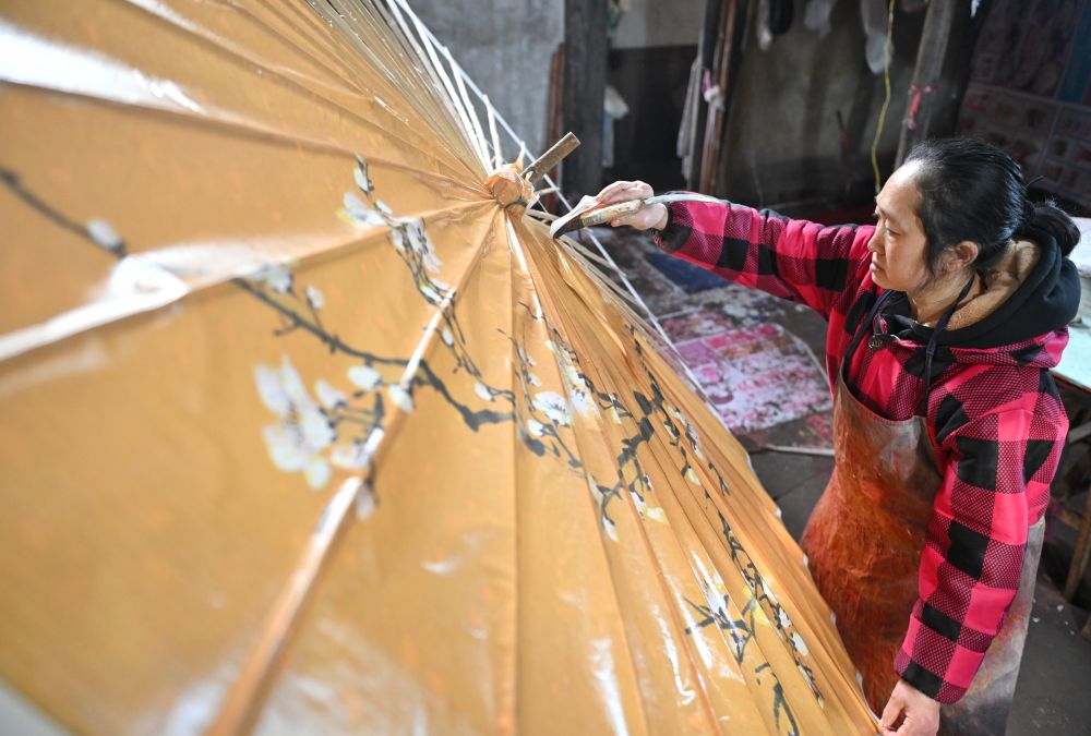 2025年2月11日,制伞师在为油纸伞上桐油。