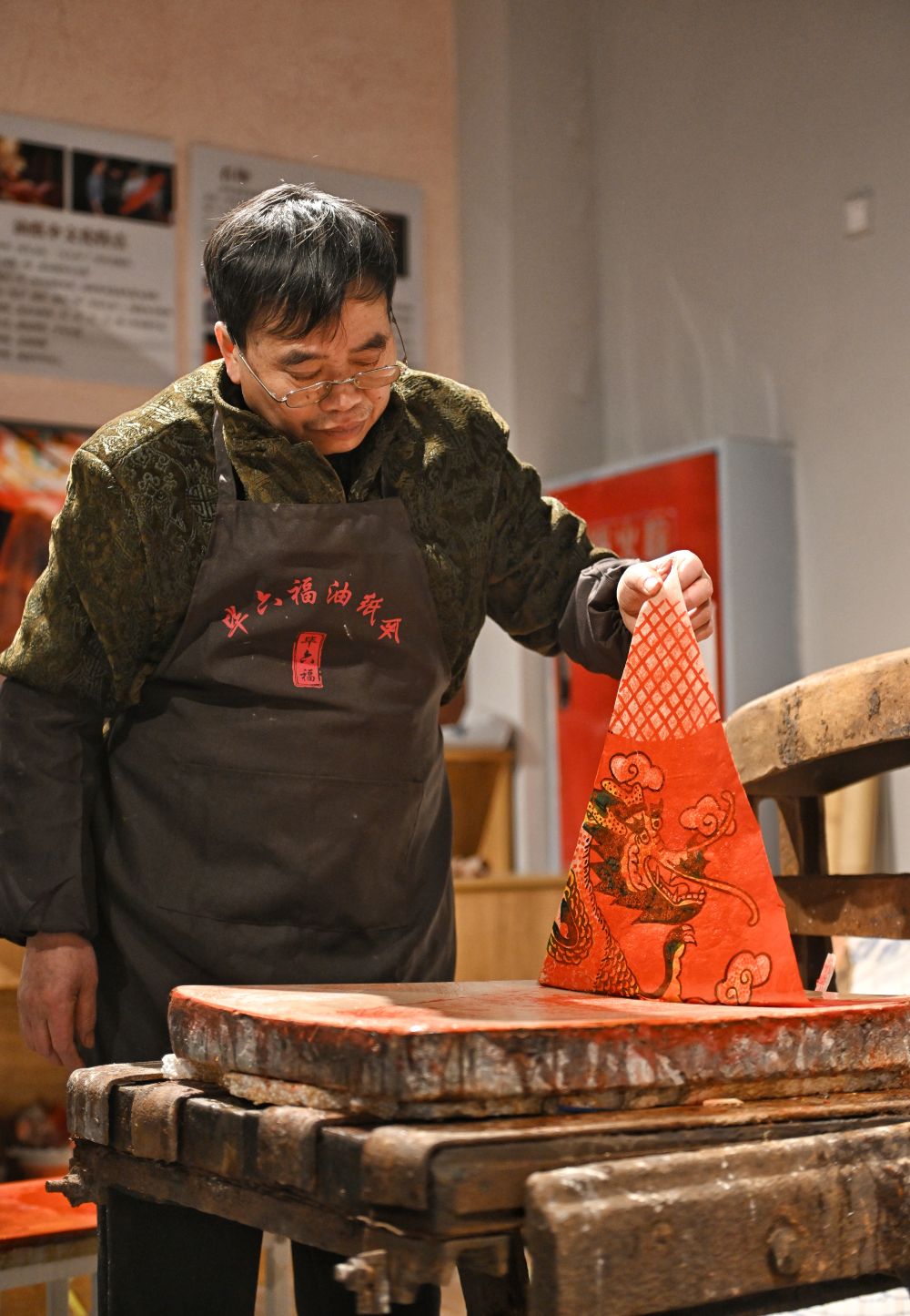 2025年2月11日,毕六福在用石板印刷术制作油纸伞图案。