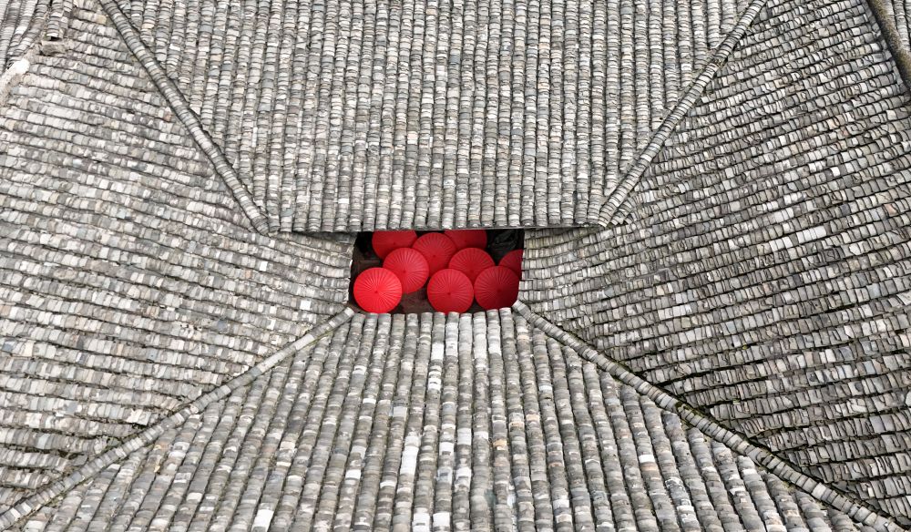 2025年2月11日,制伞师将油纸伞放到院子里晾晒(无人机照片)。