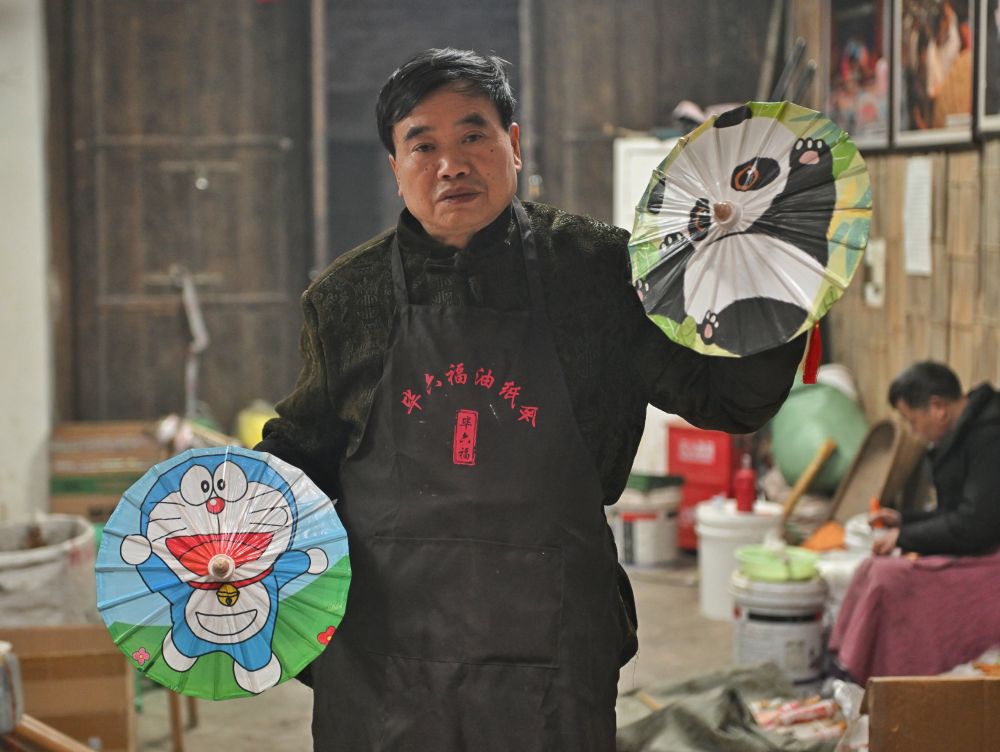 2025年2月11日,毕六福展示印有卡通图案和熊猫图案的油纸伞。