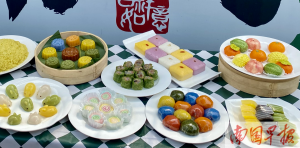 临近“三月三”,邕城五色糯米饭飘香。坚持推广南宁本土传统美食的“80后”美食达人张丽莹今年大胆创新,在五色糯米饭的制作工艺基础上,创新研发出了五色年糕、五色烧卖、五色糍粑、五色“兔子”马蹄糕等,色彩缤纷,颜值吸睛,大受年轻人、小朋友欢迎。图为多款创新“五色”美食精致诱人。记者 钟丽娅 摄(广西云-南国早报)