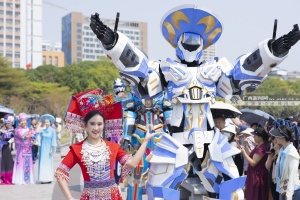 今年“三月三”不一样,全广西都有新看头。在广西三月三来临之际,连日来,从高校到中小学再到幼儿园,一场场独具特色的“民俗狂欢”在校园内上演。图为在广西艺术学院,身着民族服饰的机甲与学生同台走秀。记者 罗丹 摄(广西云-广西日报)