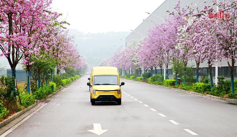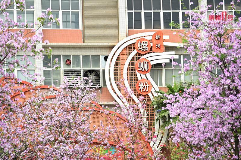 载着柳产汽车的拖卡行驶在河西工业园内。 柳州螺蛳粉产业园内 盛开的洋紫荆将园区装点成粉色