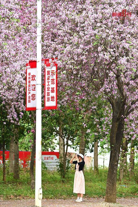洋紫荆AI上“工业风”。 当洋紫荆“粉”上“工业风” 柳州数个工业园区都沐浴在柔光中