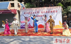 4月19日,“展非遗戏曲风华 唱民族团结赞歌”展演活动在南宁市人民公园榕荫广场举行。当天上午,在人民公园榕荫广场的大榕树下,邕剧《扈家庄》、《邕城戏韵》,粤剧《天女散花》《盗草》等传统剧目接连上演,演员们身着戏服粉墨登场,将武生的英武、花旦的娇俏活灵活现地呈现在观众面前。图为演出现场。记者 何定坚 摄(广西云-南国早报)