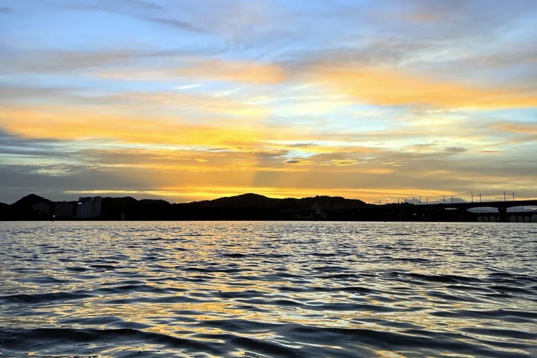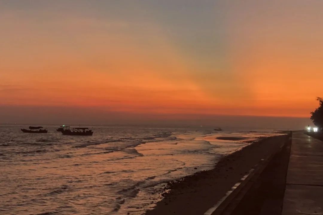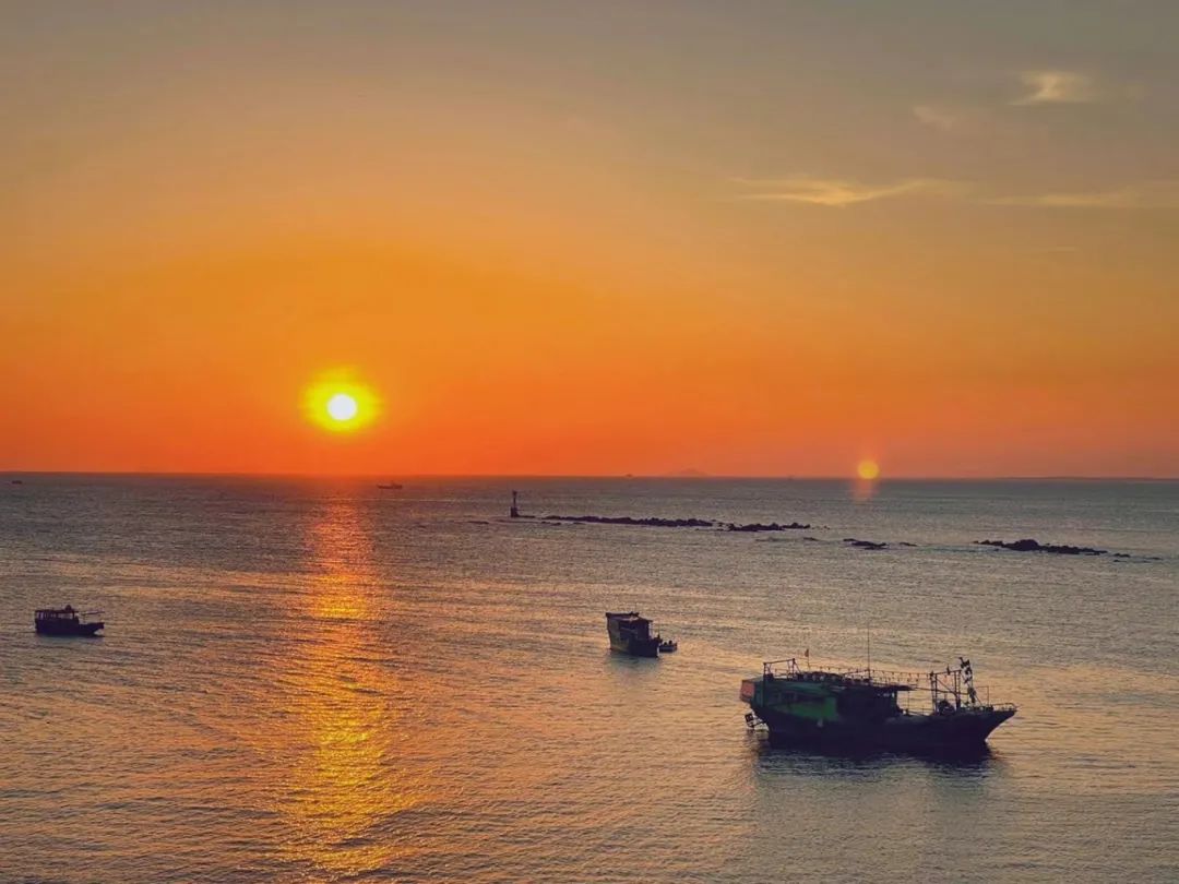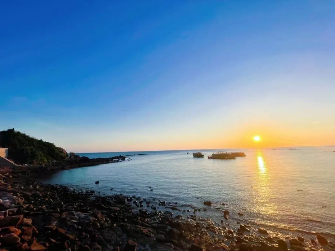 夕阳西下,余晖洒满海面 波光粼粼,美不胜收 远处海上作业的船只留下黑色剪影 成为一道风景线 于此地看日落月升 每分每秒都实在浪漫
