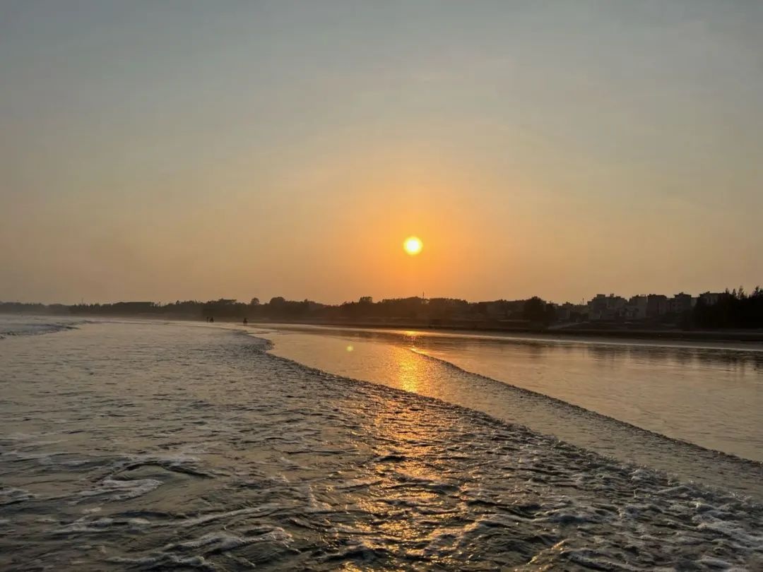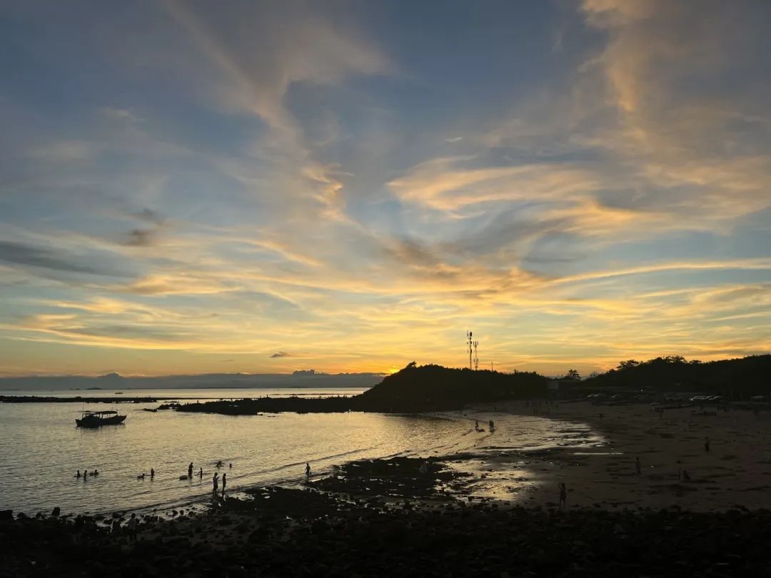 落日观赏指南 时间:18:30左右 (具体时间可查看当日天气预报) 交通:从防城港北站出发 ①打车前往(40分钟) ②乘坐11路公交车前往白浪滩风景区站(大约1小时) 地址:防城港市防城区江山半岛月亮湾西南侧6公里处 万尾金滩 傍晚的金滩 无垠的海面被染上一层金色 海浪波光粼粼 金色的沙滩与落日余晖交相辉映