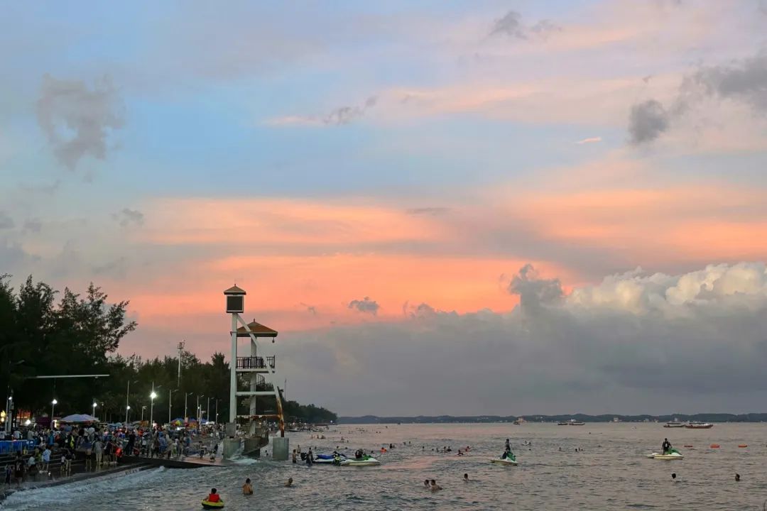落日观赏指南 时间:18:30左右 (具体时间可查看当日天气预报) 交通:从防城港北站出发 ①打车前往(25分钟) ②乘坐115路公交车前往仙人山公园站(约1小时) 地址:防城港市港口区北部湾大道西150米西湾旅游景区(东南角) 西湾城市沙滩 西湾城市沙滩处在城区 交通便捷、视野开阔 是游客欣赏日落的好去处 落日倒映在海面一片绯色 仿佛置身一片温柔的橘子海中