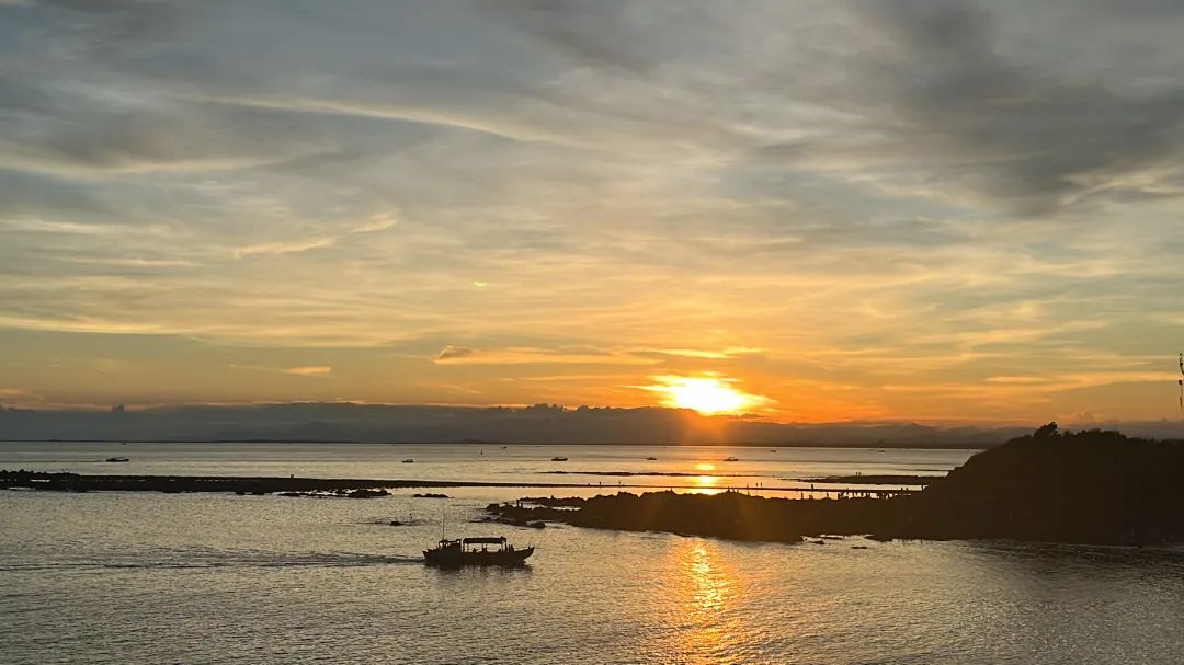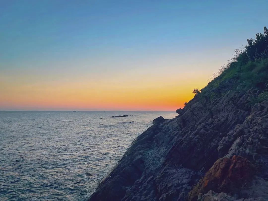 白龙古炮台旁边的半岛渔村 可以看到红日慢慢沉入海里的全过程 是欣赏日落的绝佳地之一 金色夕阳洒落在渔船上 远处青山也化作了剪影 随着暮色逐渐隐去