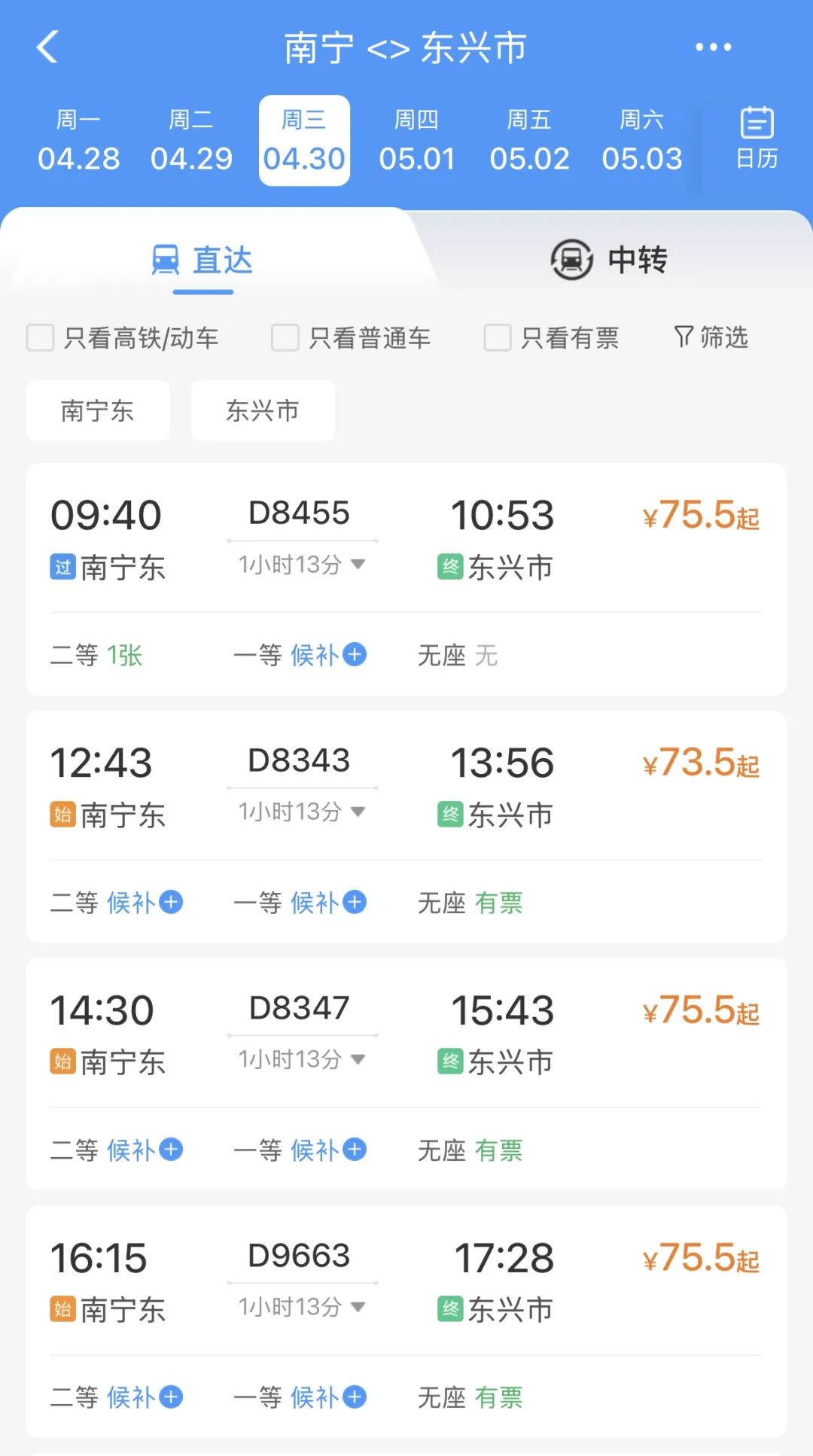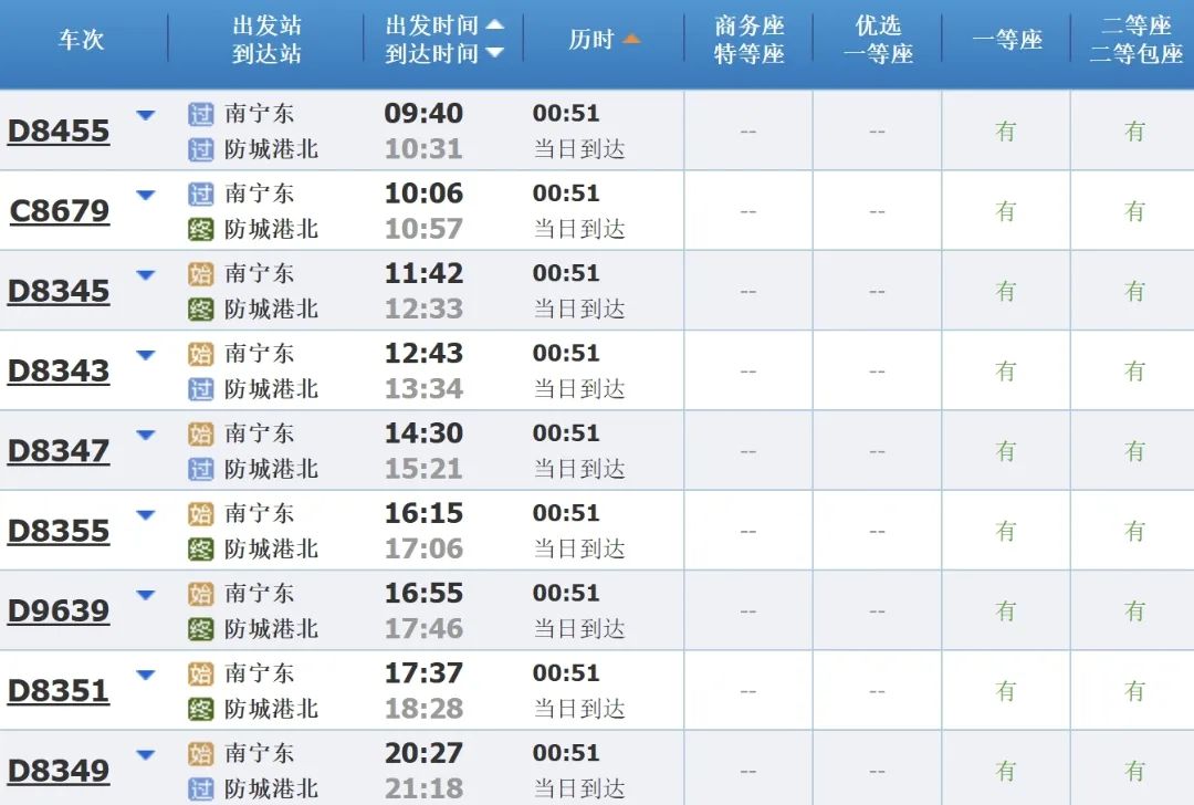 防城港北站至南宁东站最低折扣票价 仅需39.5元起 从南宁东站出发最快只需51分钟 即可到达防城港北站