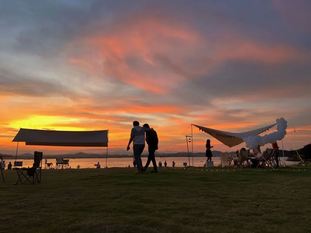沙滩边上有一大片草坪 适合露营野餐 快约上三五好友来这里 静观酡红升腾,看海听风