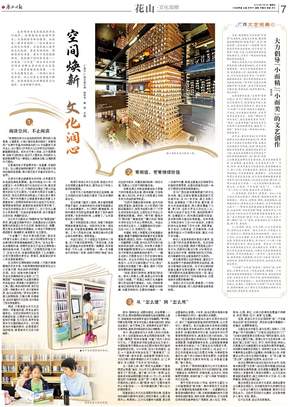 在漓江书院三祺广场店中,窗边的阅读座位最受大家欢迎。 吸引人走进来的或许是设计美学,但让人留下的永远是情绪共鸣。在这些新型公共文化空间里,阅读不再是孤立的个体行为,而是可以通过分享、讨论等形式,催生出知识共享、情感联结的社交网络,成为缓解现代社会孤独感的文化良药。 家住翡翠园小区的韦晓钰,喜欢在下班后到南宁万象城的西西弗书店闲逛,她说这是她的治愈空间。处于待业期的张新鑫也喜欢在商场里找一家书店待着:“商场里的书店氛围相对轻松一些,能让我调整最近的状态。”对张新鑫来说,这是他拨开迷雾的精神旷野。 新型公共文化空间,更像是一个可纳万物的多维容器,将人类的情感涟漪悉数收揽。 从“怎么建”到“怎么用” 挑书、刷身份证、放图书感应、点击屏幕……两三秒后,图书借阅成功的信息在自动借阅机上显示,张超拿起书回到候车座位开始翻阅。“等车嘛,闲着也是闲着,拿本书在路上看看也挺好的,到站后也能还。”由于异地工作,他每周末往返于南宁、北海两地,高铁读书驿站的出现让他眼前一亮。 广西高铁读书驿站·玉林北。广西图书馆供图 如今,乘坐高铁成为大多数人的出行选择,当人来人往的高铁站化身全民阅读新场景,“快交通+慢阅读”的奇妙碰撞,丰富了现代人的出行文化。广西高铁读书驿站是自治区文旅厅、中国铁路南宁局联合自治区图书馆共同打造的新型阅读空间。2024年底,经过5年的建设,全区14个高铁读书驿站实现了“通借通还”,以“纸质文献+数字资源+自助借阅”的服务方式,为出行群众提供便捷的公共文化服务,让“上车借书、车上阅读、下车还书”成为现实。 这一创新之举,使广西成为全国首个“高铁阅读全域通”省份,为公共文化服务的中国创新增添了广西元素。据了解,仅今年一季度,全区高铁读书驿站阅览量已突破101万人次;去年底推出的“书香铁路·走读广西”小程序,植入AI馆员提供线上服务;41趟“阅读·悦行”主题书香列车让书香流淌……一系列数据反映了群众出行的阅读需求。 丰富的纸质文献。广西图书馆供图 搭建新型公共文化空间固然是好事,但是如何找到吸引眼球与滋养心灵的平衡点,让群众看得开心、用得舒心,让文化流量转为留量,是空间运营者的必答题。5年来,自治区图书馆馆长秦小燕和她的伙伴们一直在想办法破题。 “现在高铁读书驿站大部分采用开放式设计,减少了墙面给旅客造成的视觉阻碍,让大家可以一眼看见。我们也通过举办各种活动提高大家对高铁读书驿站的认知度,吸引更多旅客走进来,知道这里有书可以看,在旅途中可以尽情享受阅读的快乐,就是我们努力的目标。”目前自治区图书馆正持续优化广西高铁读书驿站资源配置、构建智慧服务体系,让旅客能更便捷地使用读书驿站。“为了更适应当代阅读习惯,我们一直在加大对电子书的投入;在全区14个设区市的高铁出站口设置还书箱,方便旅客快捷还书;接下来计划举办常设性展览,为旅客提供更丰富的文化服务和体验,让书香直达基层。”秦小燕说。 自助智能设备。广西图书馆供图 近年来,广西持续完善现代公共文化服务体系建设,高度重视新型公共文化空间的打造,按照“规模适当、布局科学、环境优美、业态多元、特色鲜明”的原则,创新打造了一批“小而美”的新型公共文化空间。 南宁市新华书店23号店、桂林市七星区24小时智慧阅读“微书馆”、柳州紫荆花文化创意廊、北海涠洲岛海岛智慧书房……从温馨的社区角落到如画的景区一隅,从熙熙攘攘的候车厅到海浪轻拍的海岛,城市书房、阅读驿站、文化创意空间如雨后春笋般在广西涌现,嵌入社区、学校、商场、公园、景区,以极大的便利性覆盖不同群体,形成“阅读+社交+美育”生态圈。