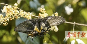 近日,九万山国家级自然保护区在蝴蝶多样性监测中,首次同时记录到国家一级保护动物金斑喙凤蝶雌雄个体。这一发现对该物种繁育研究具有重要意义。通讯员 卢志猛 摄(广西云-南国早报)