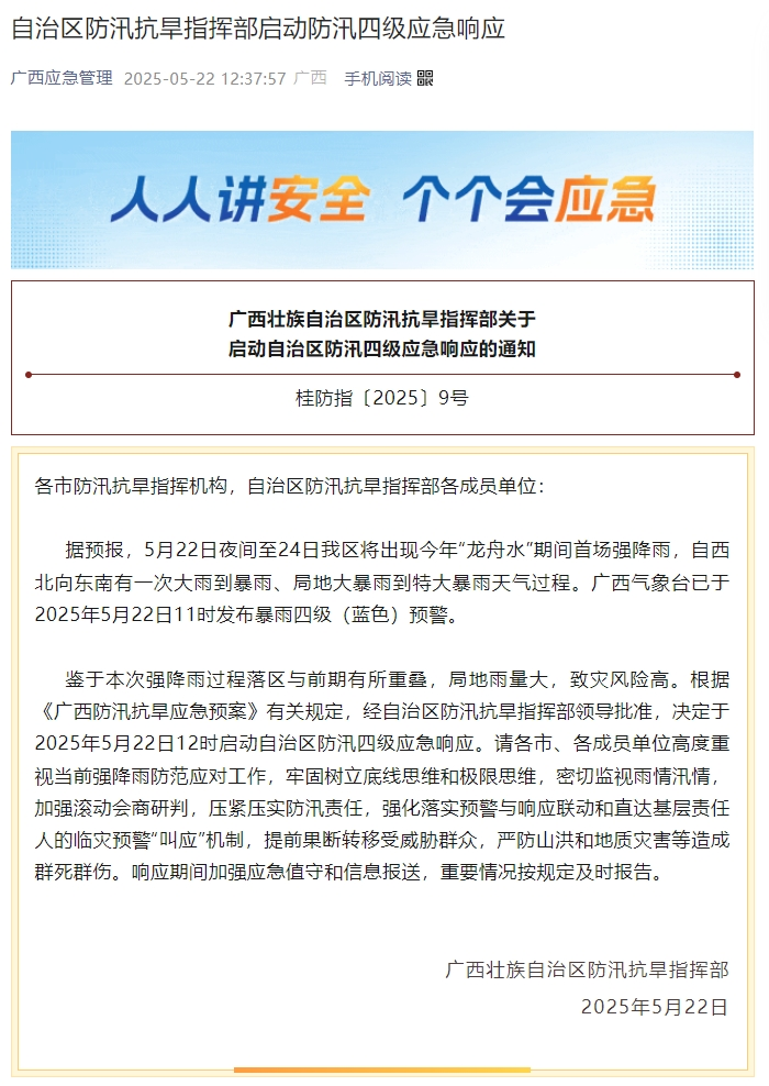 5月22日,自治区防汛抗旱指挥部下发通知,决定于2025年5月22日12时启动自治区防汛四级应急响应。