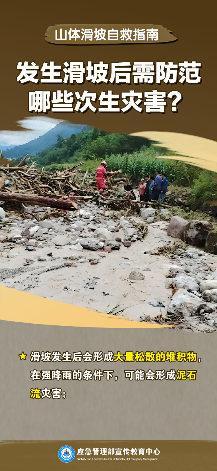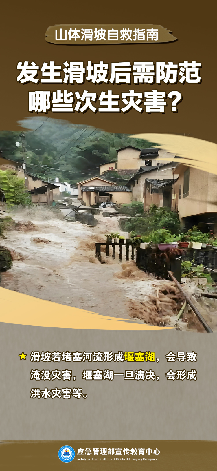 2. 当无法逃离时,应迅速抱住身边的大树等固定物体,或躲避在结实的障碍物下。 3. 滑坡停止后,应继续待在安全区域,切勿立即返回灾害区搜挖财物,避免二次遇险。 发生滑坡后 需防范哪些次生灾害? 1.滑坡后还可能发生二次滑坡或崩塌灾害。滑坡源区的后壁和两侧往往有临空面,是发生二次滑坡的高风险部位; 2.滑坡发生后会形成大量松散堆积物,在强降雨条件下可能形成泥石流灾害; 3.滑坡若堵塞河流形成堰塞湖,可能导致淹没灾害,堰塞湖一旦溃决,会形成洪水灾害等。