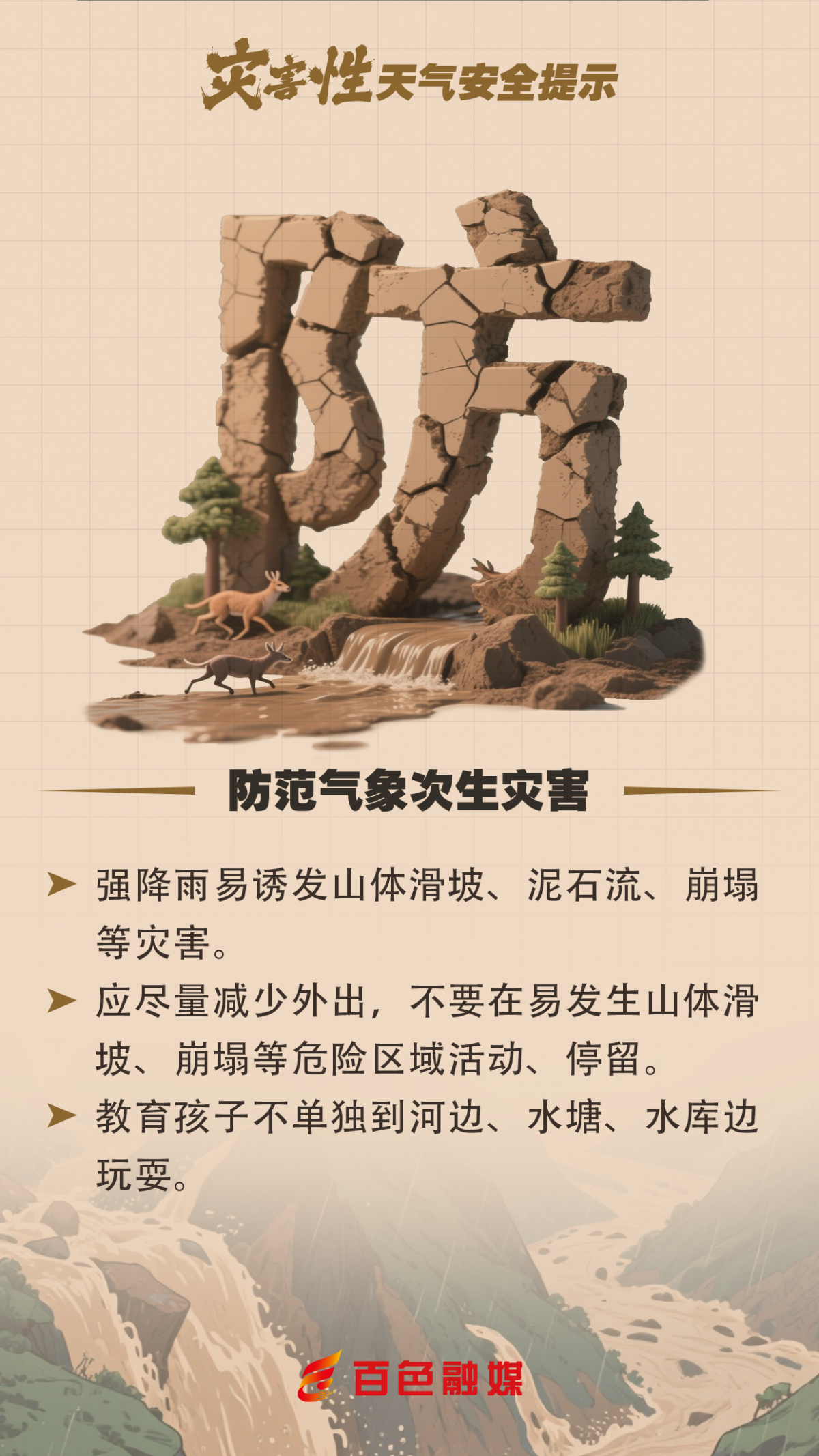 目前 百色已进入“龙舟水”集中期 强降雨、雷电、大风等 强对流天气频发 山体滑坡、泥石流、城乡内涝等 灾害风险加剧 这份灾害性天气安全提示请收好!