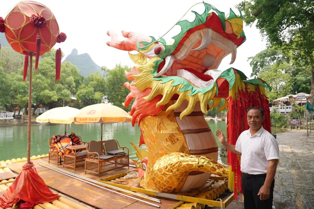 5月31日,龙凤呈祥的现场图。通讯员 夏立慧 摄 晚上7点半,巡游正式开始。“金龙”从遇龙桥上游开始,穿过遇龙桥,游至蟠龙洲,绕洲一周后便调头回到遇龙桥,与“金凤凰”相聚,整个巡游历时约1个小时。 “金龙巡游”背后的故事 阳朔县白沙镇遇龙村党总支书记、村委主任封志伟介绍:“‘金龙巡游’自2024年9月开始正式对外运营,游客们可以买票坐竹筏体验。” 如今,“金龙巡游”的吸引力越来越大,回忆起“金龙”背后的故事,封志伟自豪不已。 封志伟介绍,遇龙桥建于明朝永乐年间,距今600多年,有了遇龙桥便有了遇龙村。而遇龙河原名“安乐水”,后来改为遇龙河,村里还有块“遇龙石”,距离遇龙河仅百米。