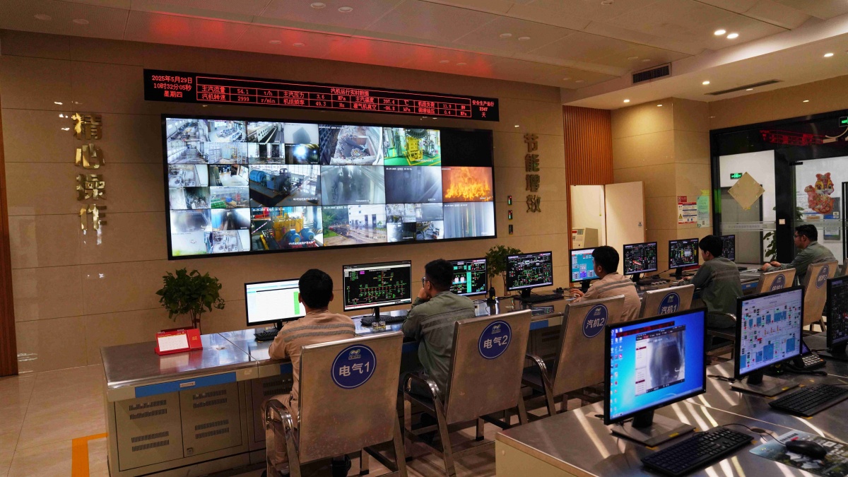 河池旺能花园式厂区一角。 在河池旺能厂内操控室,近10名工作人员紧盯大屏幕,监测生产各环节实况,监控指标实时呈现,其中“CEMS参数”即垃圾焚烧排放的各类烟气指标,同步投放至厂区门口屏幕上实时向社会公开,接受社会监督,数据还联网发送至市、自治区和国家生态环境部门。