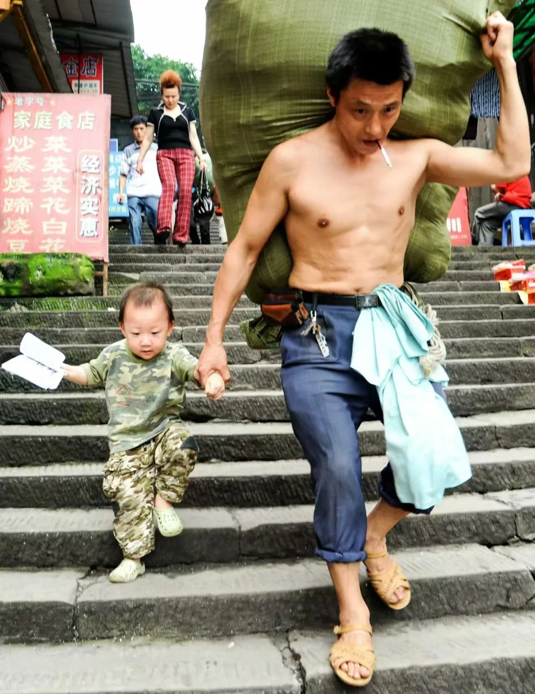 2024年,镜头前并肩而立的少年和父亲。许康平 摄 如今 照片里的孩子 已长得跟父亲一样高 带着对未来的憧憬 走进了高考考场 只是,这一天 父亲没有再牵着他的手 没有去考场送考、等候 而是像往常一样 扛着货物 默默为孩子祝福 “我不想给娃压力 让他自己去发挥 未来的路是他自己的” 这位父亲名叫冉光辉 在重庆朝天门批发市场一带 当搬运工 当地俗称“棒棒” 他用一根“棒棒”和自己的身躯 撑起了一个小家庭