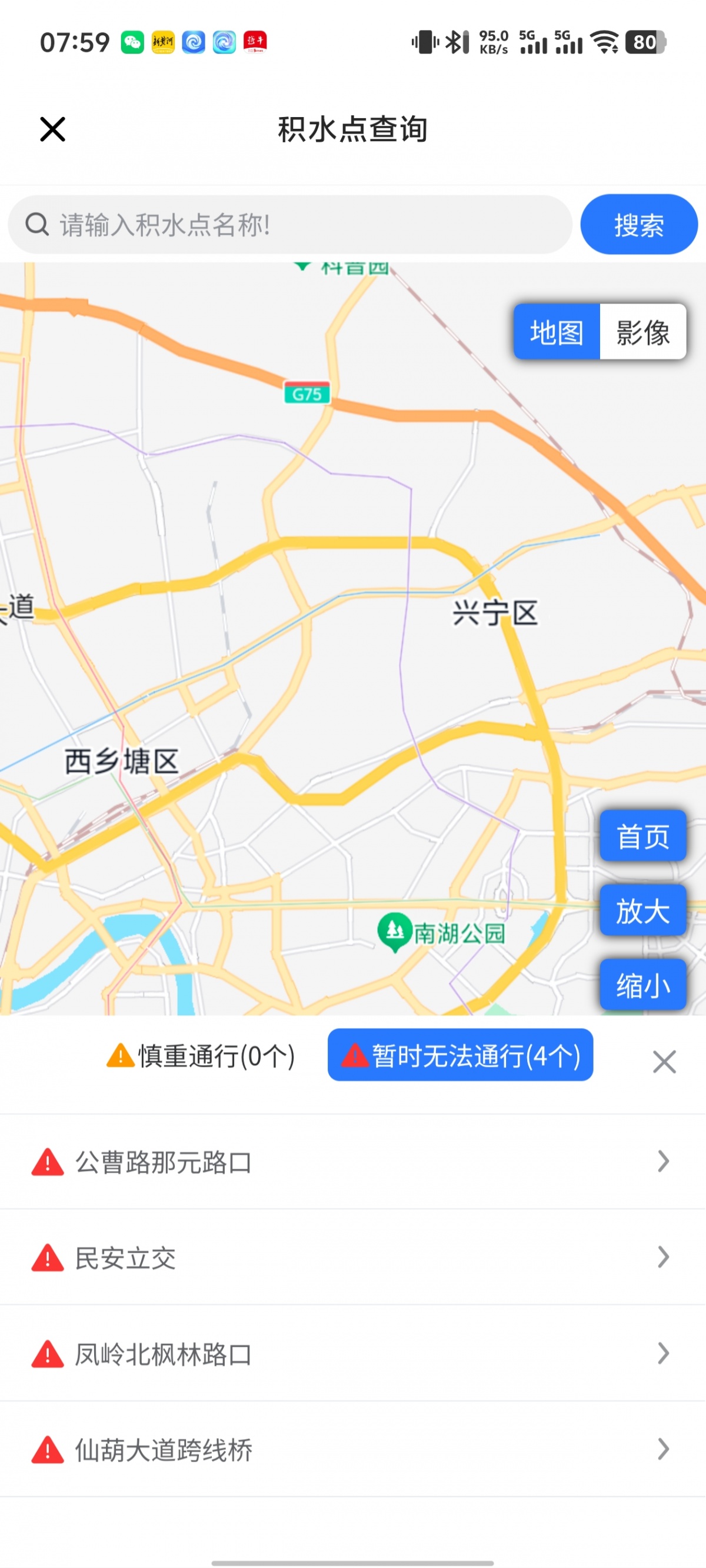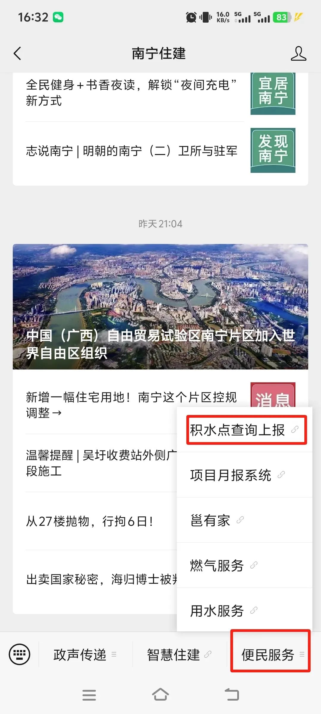 方式二:通过“南宁住建”微信公众号,点击“便民服务”,再点击“积水点查询上报”,即可进入小程序。
