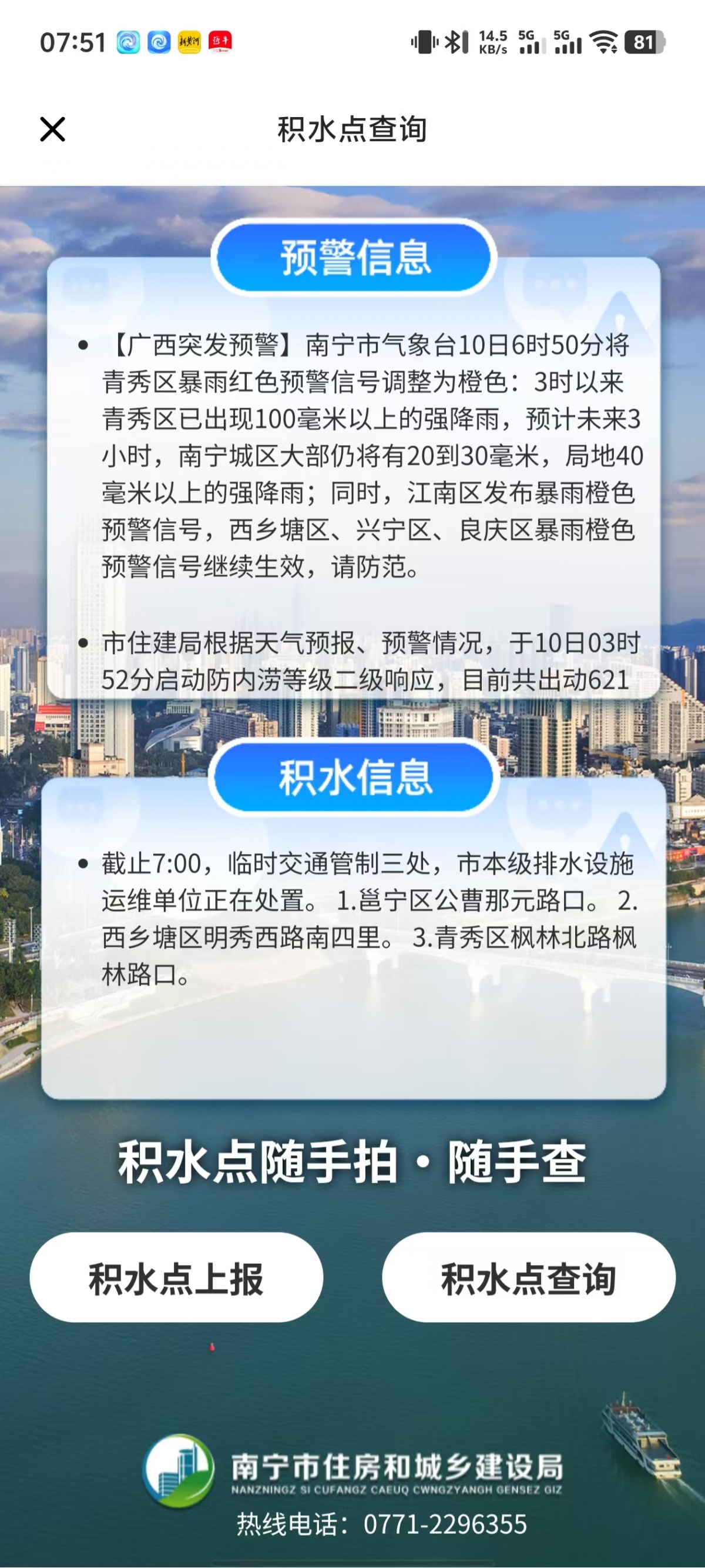 据南宁市气象台,6月10日,南宁城区大部将有强降雨。市民如遇上内涝积水问题,可以通过“积水点随手拍·随手查”小程序或“南宁住建”公众号“内涝点上报”一键上报,实现专人快速处置。