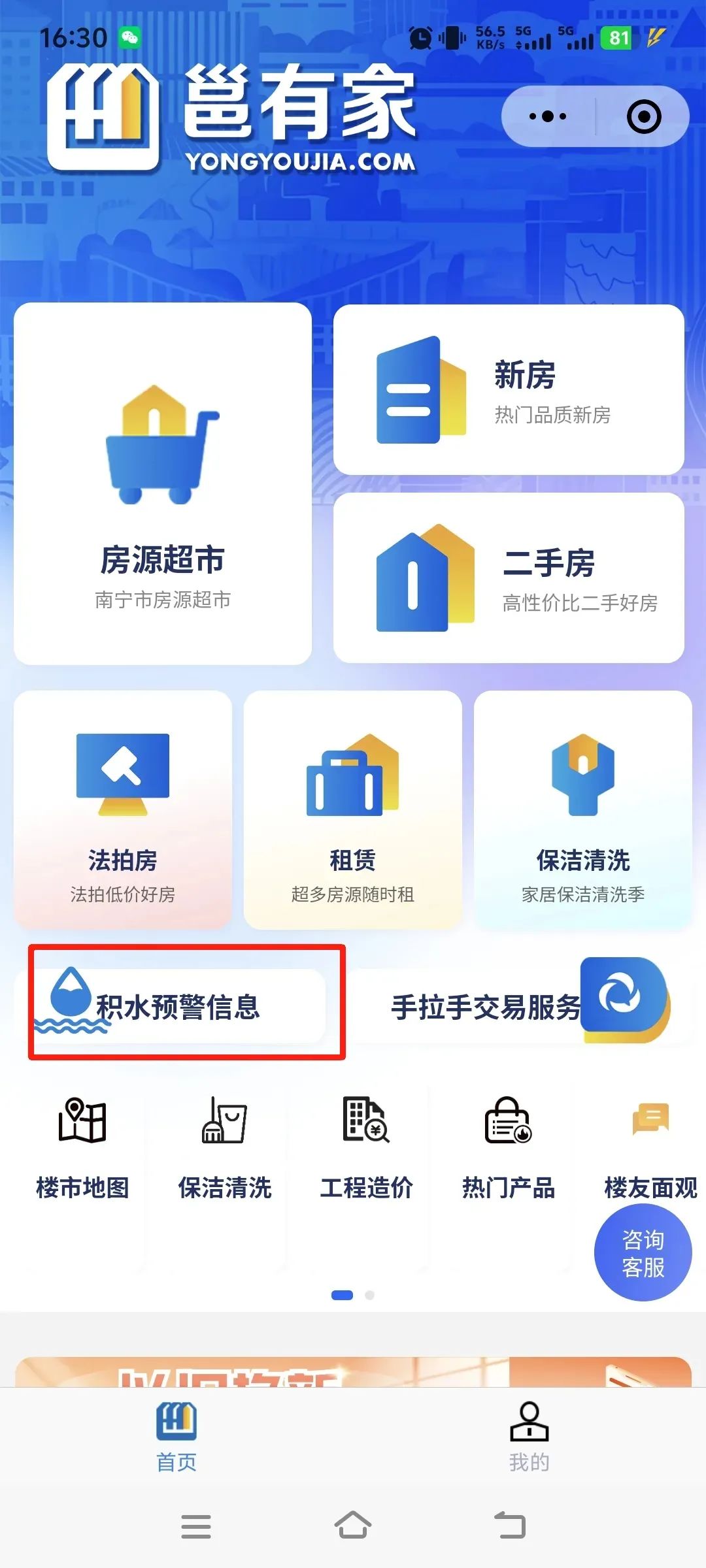 方式三:在微信小程序搜索“邕有家”小程序,点击“积水预警信息”进入小程序。