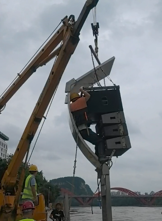 6月20日,记者从柳州市城市照明管理处获悉,受汛期柳江水位上涨影响,6月19日开始柳江音乐喷泉暂停开放。 20日上午,记者来到柳江河边音乐喷泉亲水平台看见,柳江河水涨速非常快,工作人员正在抓紧时间,对11组喷泉音响进行拆除。