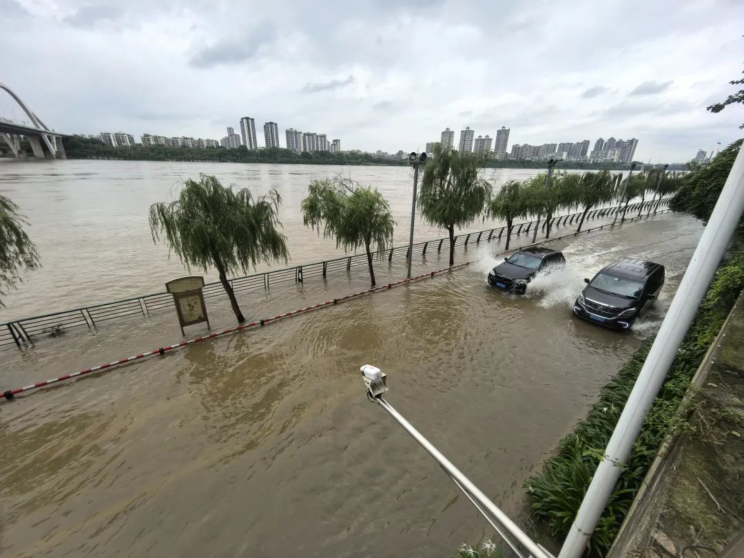 江水漫过滨江西路亲水平台以及滨江西路部分路段,柳北交警大队已在滨江西路部分路段放置“水淹路段车辆请绕道通行”的警示牌。