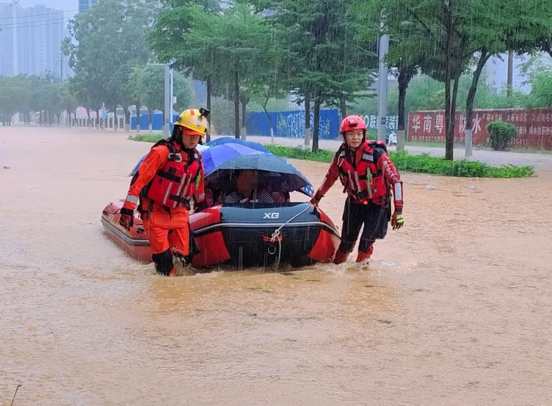 救援人员转移被困群众 。陆定鑫 摄 为应对本次内涝情况,百色市交警、城管、消防救援等部门紧急出动,合力开展排涝保安全工作。 全力排涝抢险 保障城市安全运行 市城市管理监督局迅速响应,组织力量全力排涝抢险,保障城市安全运行。 6月21日上午,百色城区出现了超过7个的内涝点,积水面积将近1000平方米。“雨势太大,树叶、塑料袋、淤泥都堆积在篦子口,不及时清理,积水排不出去,路面很快会被淹没,车辆就难以通行。”在积水点旁,百色市城市公共照明管理中心主任黄贞升和同事用铁钩打开雨水篦子,仔细清理堆积的树枝、塑料袋等杂物。 为做好内涝安全保障工作,百色市城市公共照明管理中心还拉网式对城区照明设施进行了巡查维护。“我们对积水较深路段的路灯及时采取了断电措施,严防灯杆漏电等安全问题,保障群众的出行安全。”黄贞升说。 据悉,为应对本次内涝情况,市城市管理监督局出动了110多名工作人员,分布在7个内涝点进行应急处置,主要工作是进行下水道疏通、临时交通管制等。“ 截至6月21日15:00,积水已经基本消退,我们还将持续关注降雨情况,采取积极主动的措施,最大限度降低内涝对群众生产生活的影响。”市城市管理监督局副局长陈朝裕说。
