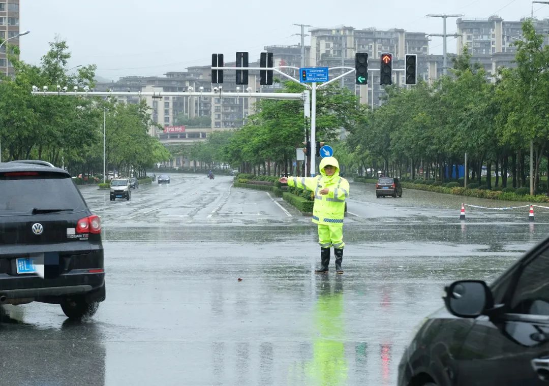 交警在指引车辆绕行避开积水区域。百色市公安局交警支队供图