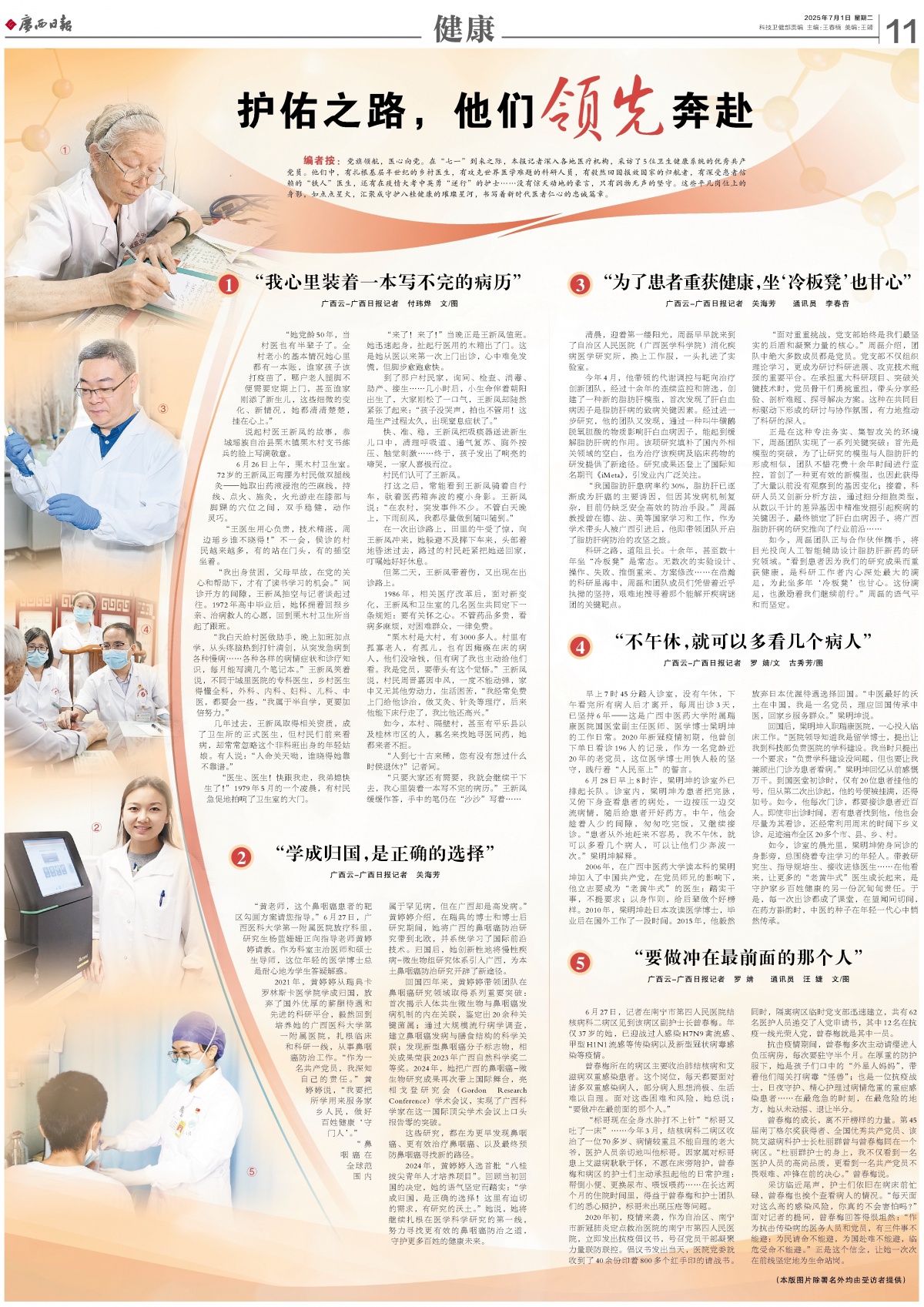 新闻眼党旗领航,医心向党。在“七一”到来之际,广西日报记者深入各地医疗机构,采访了5位卫生健康系统的优秀共产党员。他们中,有扎根基层半世纪的乡村医生,有攻克世界医学难题的科研人员,有毅然回国报效国家的归航者,有深受患者信赖的“铁人”医生,还有在疫情大考中英勇“逆行”的护士……没有惊天动地的豪言,只有润物无声的坚守。这些平凡岗位上的身影,如点点星火,汇聚成守护八桂健康的璀璨星河,书写着新时代医者仁心的忠诚篇章。 “我心里装着一本写不完的病历” ■广西云-广西日报记者 付玮烨 “她党龄50年,当村医也有半辈子了。全村老小的基本情况她心里都有一本账,谁家孩子该打疫苗了,哪户老人腿脚不便需要定期上门,甚至谁家刚添了新生儿,这些细微的变化、新情况,她都清清楚楚,挂在心上。” 说起村医王新凤的故事,恭城瑶族自治县栗木镇栗木村支书练兵的脸上写满敬意。 6月26日上午,栗木村卫生室。72岁的王新凤正弯腰为村民做双腿线灸——她取出药液浸泡的苎麻线,持线、点火、施灸,火光游走在膝部与脚踝的穴位之间,双手稳健,动作灵巧。