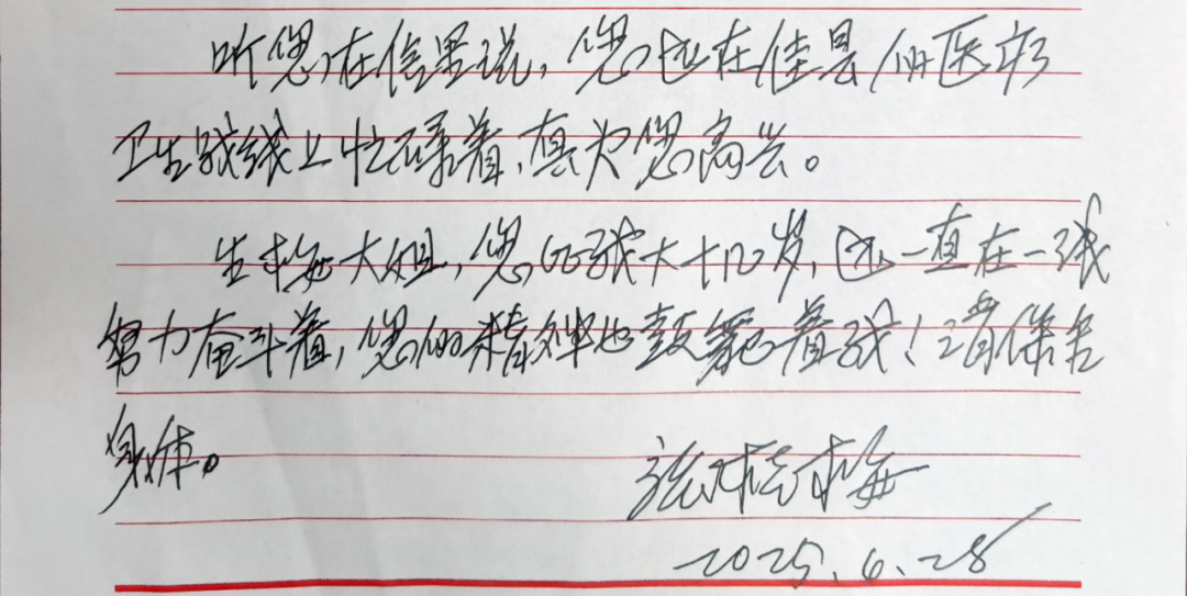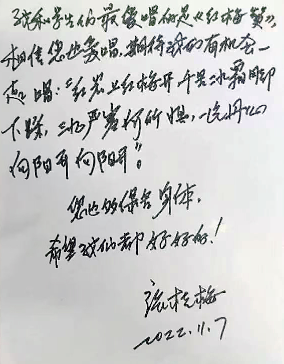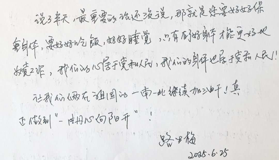 路生梅于2025年6月25日写给张桂梅的信件(节选)。新华社发 路生梅与张桂梅 结缘于 2022年11月的一次通信 当时 路生梅在给张桂梅的信中写道: “我们的名字都有‘梅’ 都是共产党员 都以江姐为偶像” 张桂梅则在信中对路生梅说: “我和学生们最爱唱的是《红梅赞》 期待我们有机会一起唱”