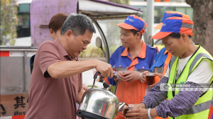 连日来,持续高温天气给户外工作者带来严峻“烤”验。梧州市万秀区,推出一系列暖心举措,为坚守岗位的户外工作者送去关怀与清凉。图为7月11日,工作人员为环卫工人送上凉茶。通讯员 莫焜 摄(广西云-广西日报)