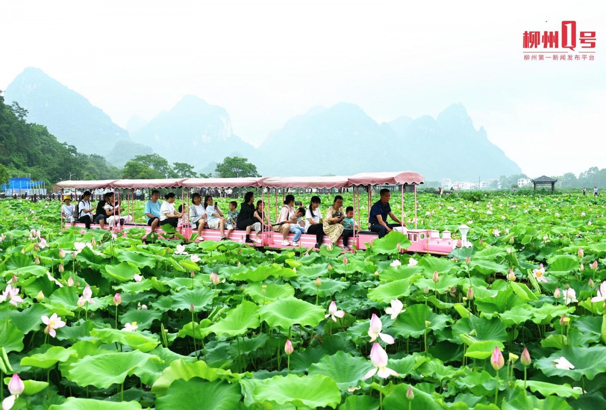 游客乘坐小火车赏荷 据悉,因天气原因,今年柳江区百朋镇荷花种植较晚,预计将在7月中下旬迎来盛花期。届时,当地将以花为媒,举行非遗文创周、荷花美食文化节、荷田服装秀等活动。