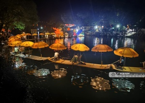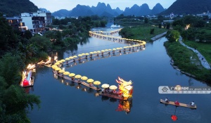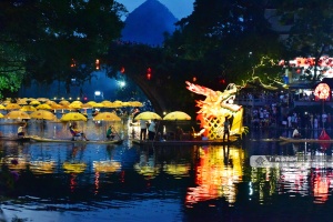 暑期来临,桂林市阳朔县遇龙河夜色中的金龙巡游吸引了众多游人纷至沓来,乘筏巡游和岸上观景的游人相映成景,构成一道独特的风景线,带热暑期桂林山水旅游。图为金龙巡游。廖祖平 摄(广西云-广西日报)