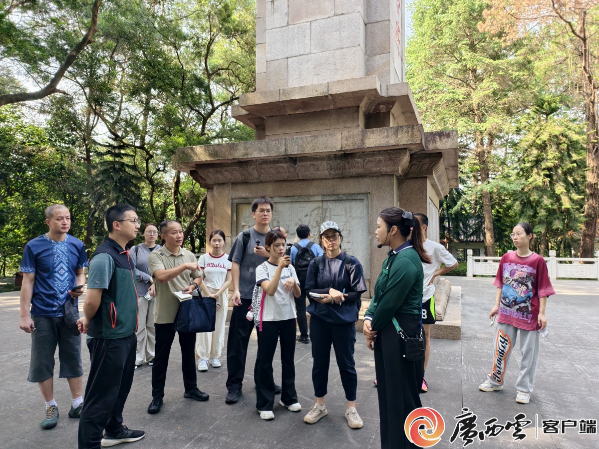 冯金金在广西学生军抗日史料陈列馆讲解。 冯金金是土生土长的南宁人。她与广西学生军抗日烈士纪念碑的缘分,早在她读小学时就已悄然缔结。“每年五四青年节,我们都会列队来到这里,献上亲手制作的小白花,听老师讲述那些14至18岁的同龄人投笔从戎的故事。”那些稚嫩却坚毅的面庞,在她心中留下了不可磨灭的印记。 “他们和我们年纪相仿,却扛起了救亡图存的重担。”这份年少时的震撼,成为她日后选择职业的方向。三年前,冯金金成为南宁青秀山风景名胜旅游开发有限责任公司青秀山旅游服务部的讲解员。 “每年有15万人次、100多批次团队来这里瞻仰先烈,学生占了大半。”冯金金说,看着孩子们仰着头听故事的模样,让她想起当年的自己。