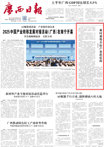 2025年7月20日,以“AI赋能谋新篇产业协作创未来”为主题的2025中国产业转移发展对接活动(广西)在南宁举行。广西云-广西日报记者 黄克 邓华 摄 中国产业转移发展对接活动(广西)已成功举办两届,共签约项目716个、总投资6966亿元。“产业兴则经济兴,产业强则经济强”。在这些产业项目带动下,今年上半年,广西规上工业增加值、工业投资均实现较大幅度增长,有力带动GDP稳步增长。 树高千尺有根,水流万里有源。正是有党中央、国务院的高度重视,国家部委的悉心指导,社会各界的鼎力支持,广大企业家的信任厚爱,广西的“朋友圈”才越发扩大,“产业林”才更加繁茂。 “产业林”繁茂,既孕育希望,又积蓄力量。当前,广西产业集聚效应加速凸显,有色金属、汽车、机械等传统产业厚积薄发,新能源、新材料、电子信息等新兴产业发展势头迅猛。广西正在迎来历史最好发展时期。与美好时势同行,无边胜景在前方。今年的中国产业转移发展对接活动(广西)以“AI赋能谋新篇 产业协作创未来”为主题,更加突出服务人工智能赋能,更加突出服务中央周边工作,更加突出服务产业协作,更加突出服务国家产业提质升级。 乘时而起,有信心更有定力。举办此次活动,既是顺应科技革命的必然选择,更是服务国家发展的责任担当,必将极大凝聚起东西协作、央地携手、政企同行的广泛共识,促成更多产业对接务实合作。 乘势而为,有决心更有期待。广西期待与各方携手,围绕产业链上下游开展深度合作、促进优势互补,进一步完善产业链布局,共同开拓面向东盟的数字贸易、跨境电商、智慧物流等新业态,让“广西制造”在国内国际叫得响、走得远。 乘时乘势,有希望更有路径。“人工智能+”正成为经济社会高质量发展的新引擎。广西抢抓国家实施人工智能能力建设普惠计划等重大机遇,加快推进重大项目建设,不断拓宽发展路径,服务构建更为紧密的中国—东盟命运共同体,积极参与高质量共建“一带一路”。面向AI产业新蓝海,广西诚邀四方群贤宾客共享机遇、作出选择、投资未来。 广西的机遇,也是中国的机遇、世界的机遇。选择广西,就是选择中国14亿人口和东盟7亿人口两个大市场;投资广西,就是投资“AI革命+产业转移”的广阔前景。我们坚信,只要全区上下以最大诚意、最好资源、最优服务,为八方宾朋选择广西、投资广西、安家广西创造一切便利条件,产业链的藤蔓一定能够跨越山海,让创新的种子在八桂大地生根结果,绘就“AI赋能、产业协作”新图景。