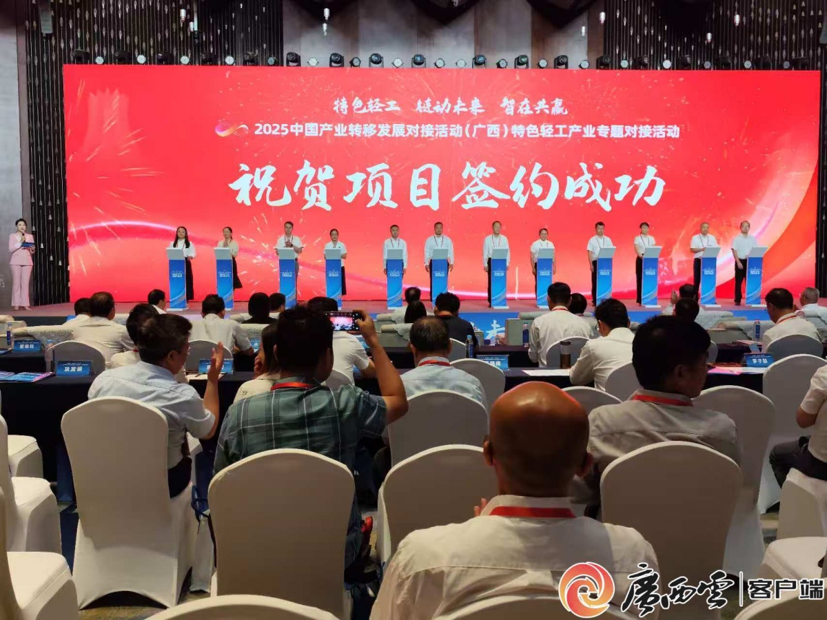 签约仪式现场。广西云-广西日报记者 邱石佑 摄 当天的对接活动中,贵港、防城港、桂林、梧州、贺州、来宾等设区市围绕各自资源禀赋和产业特色进行重点推介。活动现场还发布了2025年广西轻工产业承接产业转移重点投资机会清单,为区域产业合作搭建沟通桥梁。