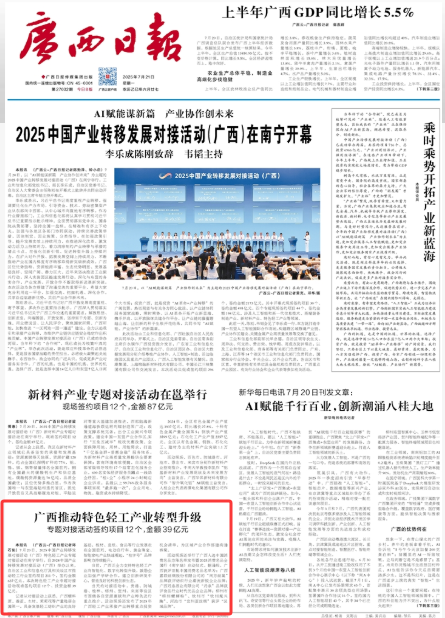 7月20日,2025中国产业转移发展对接活动(广西)特色轻工产业专题对接活动在南宁举行。自2024中国产业转移发展对接活动(广西)举办以来,自治区工业和信息化厅及相关设区市推动轻工行业签约项目211个,签约金额637亿元。本次特色轻工产业专题对接活动现场签约项目12个、投资金额39亿元。