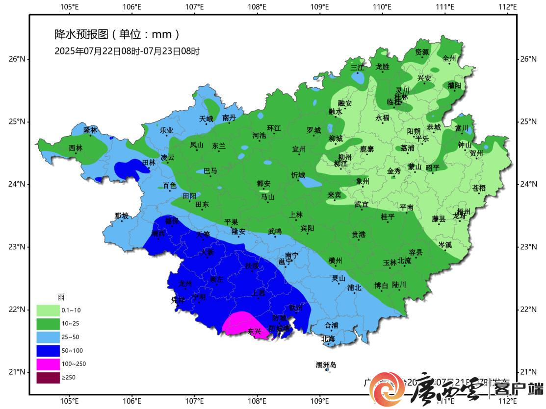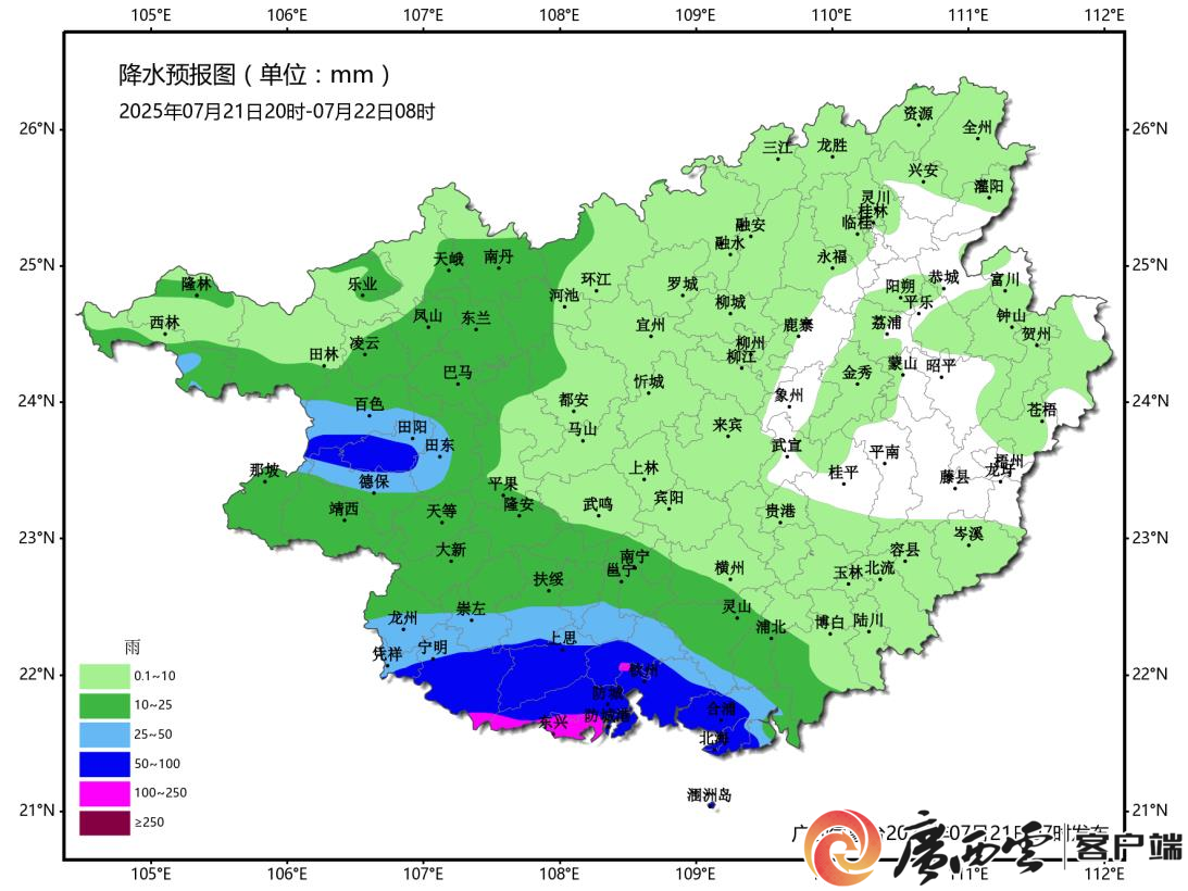 7月21日20时至7月22日8时降水预报。 22日,桂南、桂西有大雨、局地暴雨或大暴雨并伴有短时 雷暴大风等强对流天气,其他地区有小到中雨、局地暴雨。沿海和桂南部分地区最大风力5—7级、阵风8—9级。 23日,桂西有中到大雨、局地暴雨,桂东有阵雨或雷雨、局地大雨。