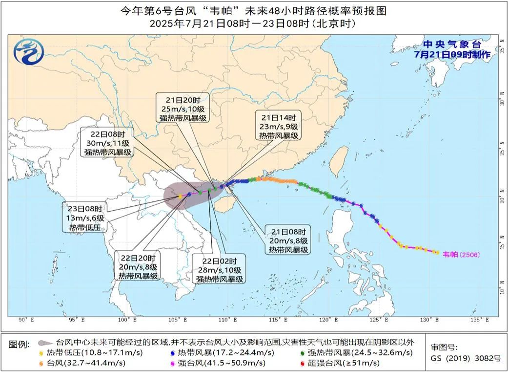 雨下了一整夜 钦州这天像是漏了一个大窟窿 今早(7月21日)还是大雨滂沱 小伙伴们出门要注意安全哦 台风的动态和未来三天的天气如何 我们一起来看看 ↓↓↓ 台风“韦帕”动态 今年第6号台风“韦帕”昨天(20日)傍晚17时50分前后在广东省台山市沿海登陆,晚上8点15分前后在阳江市海陵岛沿海再次登陆。今天09时中心位于湛江市遂溪县境内(北纬21.1度、东经109.8度),中心附近最大风力8级(20米/秒),中心最低气压为982百帕。预计,“韦帕”将以每小时15公里左右的速度向西偏南方向移动,今天上午将移入北部湾海面,随后趋向越南东北部沿海,强度将再度增强,22日白天将在越南北部沿海再次登陆。