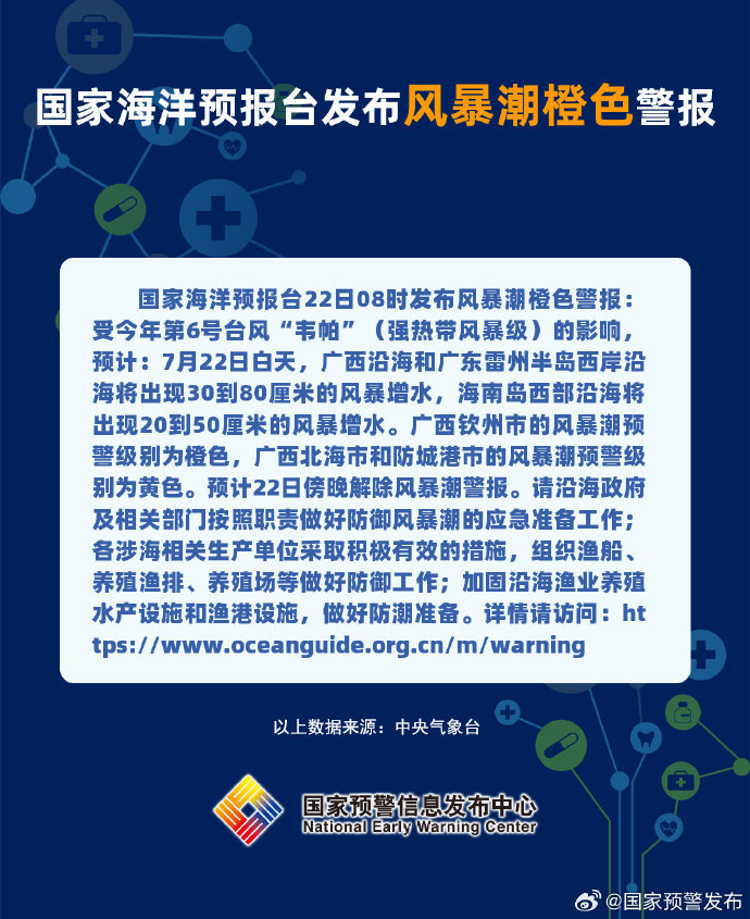 国家海洋预报台7月22日08时发布海浪蓝色警报:受今年第6号台风“韦帕”(强热带风暴级)的影响,预计:7月22日白天,北部湾将出现3到5米的大浪到巨浪区;广西、海南近岸海域将出现2到3米的中浪到大浪,近岸海域海浪预警级别为蓝色。预计今天下午至傍晚视情况解除海浪警报。 国家海洋预报台22日08时发布风暴潮橙色警报:受今年第6号台风“韦帕”(强热带风暴级)的影响,预计:7月22日白天,广西沿海和广东雷州半岛西岸沿海将出现30到80厘米的风暴增水,海南岛西部沿海将出现20到50厘米的风暴增水。广西钦州市的风暴潮预警级别为橙色,广西北海市和防城港市的风暴潮预警级别为黄色。预计22日傍晚解除风暴潮警报。