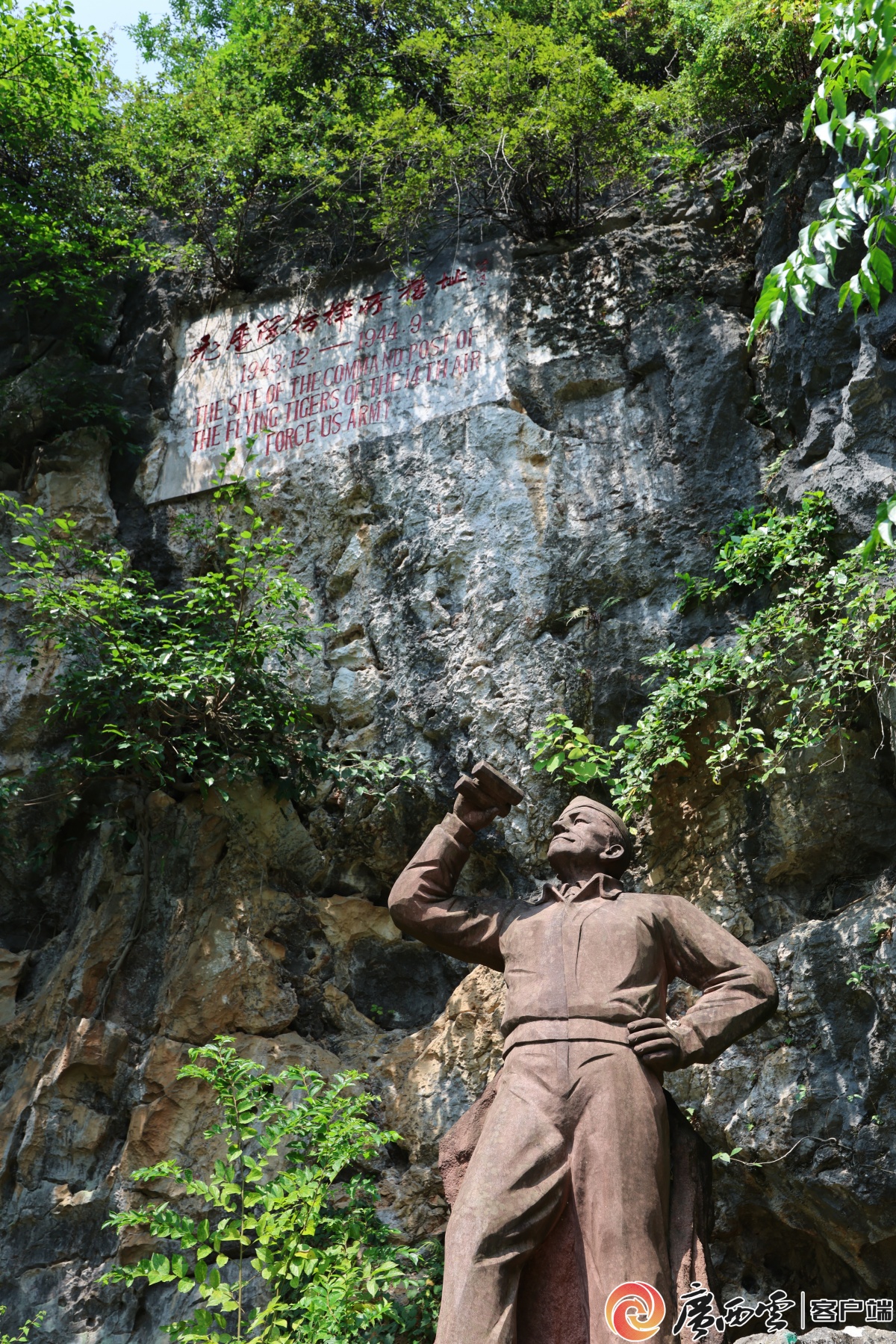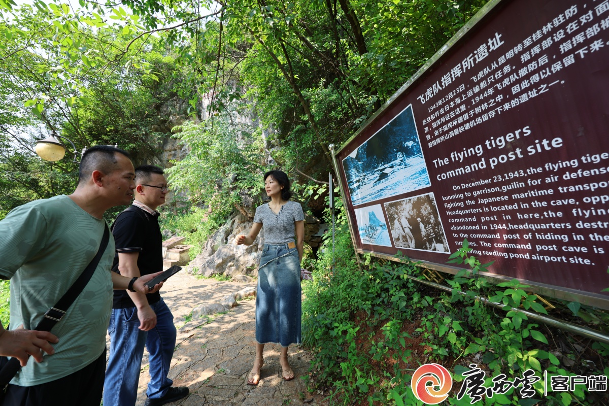 美国飞虎队在山洞的指挥所遗址。广西云-广西日报记者 覃文武 摄 7月30日,桂林市临桂区鸡公山草木蓊郁,一座被山石、藤蔓半掩洞口的溶洞前,几位游客正对着岩壁上的斑驳凿痕频频拍照。这座看似普通的山洞,正是二战时期美国飞虎队在华作战的指挥所遗址。如今经过遗址复原,当年的场景唤起了那段跨越国界、血脉相连的战斗历史。