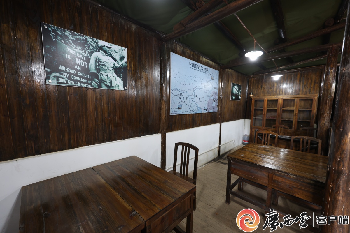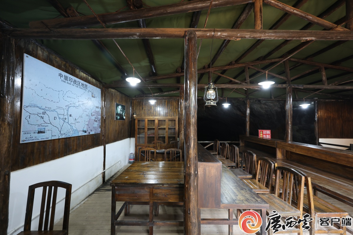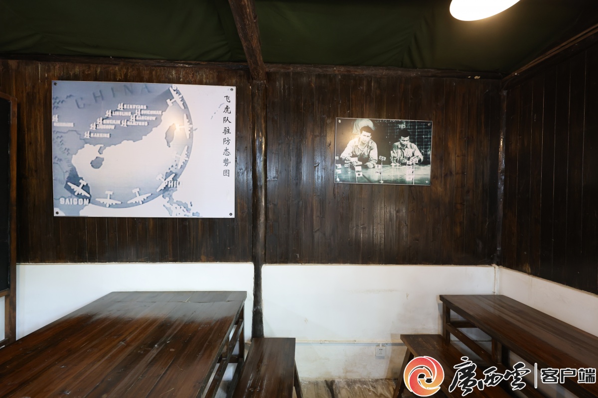 飞虎队山洞指挥所复原场景。广西云-广西日报记者 梁凯昌 摄 这处山洞指挥所常年恒温在18℃。中午12时,洞外赤日炎炎似火烧,往洞里走几步路,却是凉风习习,暑意顿消。灯光柔和地勾勒出指挥所的发报室、作战沙盘的轮廓。 “当时洞内24小时灯火通明,参谋员、通讯兵挤在约200平方米的空间里。这里是飞虎队空袭预警系统桂林4个机场的网络终端,桂林机场的作战指令都是由这里发出。”蒙燕指着墙壁上的老照片说。
