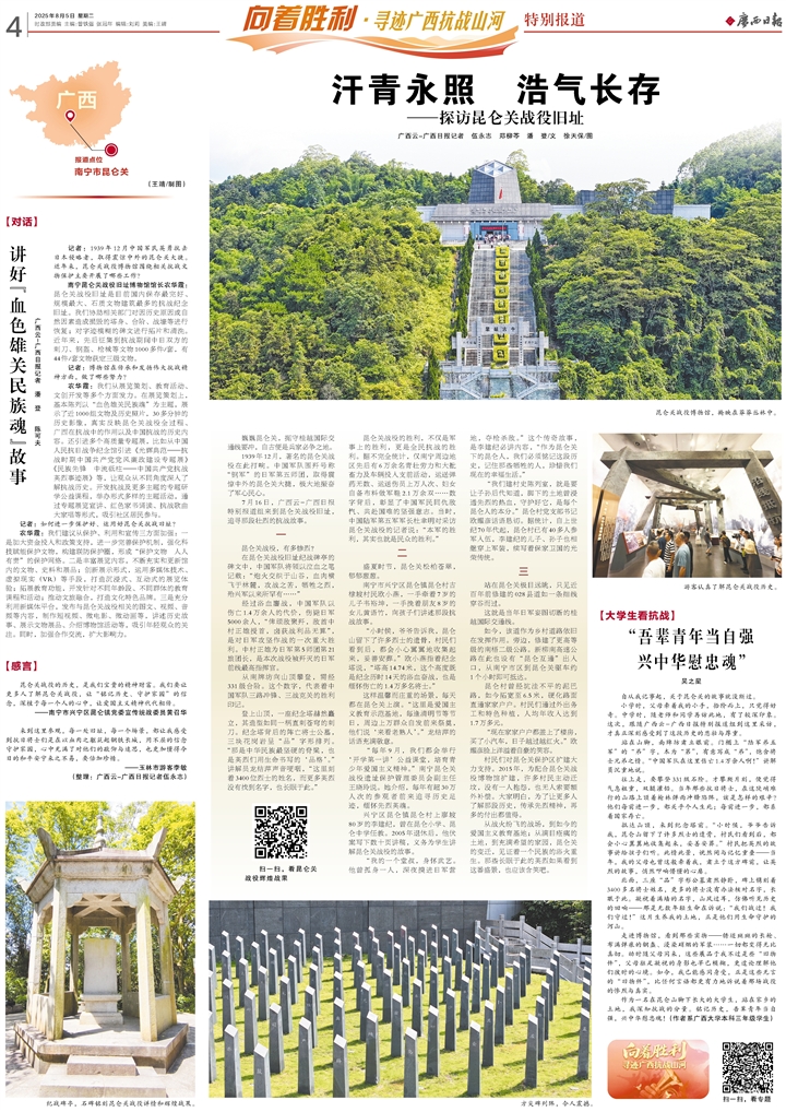 游客认真了解昆仑关战役历史。 兴宁区昆仑镇昆仑村上廖坡80岁的李建纪,曾在昆仑小学、昆仑中学任教。2005年退休后,他伏案写下数十页讲稿,义务为学生讲解昆仑关战役的故事。 “我的一个堂叔,身怀武艺。他曾孤身一人,深夜摸进日军营地,夺枪杀敌。”这个传奇故事,是李建纪必讲内容,“作为昆仑关下的昆仑人,我们必须铭记这段历史,记住那些牺牲的人,珍惜我们现在的幸福生活。” “我们建村史陈列室,就是要让子孙后代知道,脚下的土地曾浸透先烈的热血,守护好它,是每个昆仑人的本分。”昆仑村党支部书记欧耀彦话语恳切。据统计,自上世纪70年代起,昆仑村已有40多人参军入伍,李建纪的儿子、孙子也相继穿上军装,续写着保家卫国的光荣传统。 三 站在昆仑关极目远眺,只见近百年前修建的028县道如一条细线穿谷而过。 这就是当年日军妄图切断的桂越国际交通线。 如今,该道作为乡村道路依旧在发挥作用。旁边,修建了更高等级的南梧二级公路。新柳南高速公路在此也设有“昆仑互通”出入口,从南宁市区到昆仑关驱车约1个小时即可抵达。 昆仑村曾经坑洼不平的泥巴路,如今拓宽至6.5米,硬化路面直通家家户户。村民们通过外出务工和特色种植,人均年收入达到1.7万多元。 “现在家家户户都盖上了楼房,买了小汽车,日子越过越红火。”欧耀彦脸上洋溢着自豪的笑容。 村民们对昆仑关保护区扩建大力支持。2015年,为配合昆仑关战役博物馆扩建,许多村民主动迁坟,没有一人抱怨,也无人索要额外补偿。大家明白,为了让更多人了解那段历史,传承先烈精神,再多的付出都值得。 从战火纷飞的战场,到如今的爱国主义教育基地;从满目疮痍的土地,到充满希望的家园,昆仑关的变迁,见证着一个民族的浴火重生。那些长眠于此的英烈如果看到这番盛景,也应该含笑吧。 【对话】 讲好“血色雄关民族魂”故事 记者:1939年12月中国军民英勇抗击日本侵略者,取得震惊中外的昆仑关大捷。近年来,昆仑关战役博物馆围绕相关抗战文物保护主要开展了哪些工作? 南宁昆仑关战役旧址博物馆馆长农华霞:昆仑关战役旧址是目前国内保存最完好、规模最大、石质文物建筑最多的抗战纪念旧址。我们协助相关部门对因历史原因或自然因素造成损毁的塔身、台阶、战壕等进行恢复;对字迹模糊的碑文进行拓片和清洗。近年来,先后征集到抗战期间中日双方的刺刀、钢盔、枪械等文物1000多件/套,有44件/套文物获定三级文物。 记者:博物馆在传承和发扬伟大抗战精神方面,做了哪些努力? 农华霞:我们从展览策划、教育活动、文创开发等多个方面发力。在展览策划上,基本陈列以“血色雄关民族魂”为主题,展示了近1000组文物及历史照片,30多分钟的历史影像,真实反映昆仑关战役全过程、广西在抗战中的作用以及中国抗战的历史内容。还引进多个高质量专题展,比如从中国人民抗日战争纪念馆引进《光辉典范——抗战时期中国共产党党风廉政建设专题展》《民族先锋 中流砥柱——中国共产党抗战英烈事迹展》等,让观众从不同角度深入了解抗战历史。开发抗战及更多主题的专题研学公益课程,举办形式多样的主题活动,通过专题展览宣讲、红色家书诵读、抗战歌曲大家唱等形式,吸引社区居民参与。 记者:如何进一步保护好、运用好昆仑关抗战旧址? 农华霞:我们建议从保护、利用和宣传三方面加强:一是加大资金投入和政策支持,进一步完善保护机制,强化科技赋能保护文物,构建联防保护圈,形成“保护文物 人人有责”的保护网络。二是丰富展览内容,不断充实和更新馆内的文物、史料和展品;创新展示形式,运用多媒体技术、虚拟现实(VR)等手段,打造沉浸式、互动式的展览体验;拓展教育功能,开发针对不同年龄段、不同群体的教育课程和活动;推动文旅融合,打造文化特色品牌。三是充分利用新媒体平台,发布与昆仑关战役相关的图文、视频、音频等内容,制作短视频、微电影、微动画等,讲述历史故事、展示文物展品、介绍博物馆活动等,吸引年轻观众的关注。同时,加强合作交流,扩大影响力。 【大学生看抗战】 广西大学本科三年级学生吴之星: “吾辈青年当自强,兴中华慰忠魂” 自从我记事起,关于昆仑关的故事就没断过。 小学时,父母牵着我的小手,拾阶而上,只觉得好奇。中学时,随老师和同学再访此地,有了较深印象。这次,跟随广西云-广西日报特别报道组到这里采访,才真正深刻感受到了这段历史的悲壮与厚重。 站在山脚,南牌坊肃立眼前。门楣上“陆军弟五军”的“弟”字,本为“第”,有意写成“弟”,饱含将士兄弟之情。“中国军队在这里伤亡1.4万余人啊!”讲解员沉重地说。 往上走,要攀登331级石阶。才攀爬片刻,便觉得气息粗重,双腿灌铅。当年那些抗日将士,在这陡峭难行的山路上顶着枪林弹雨冲锋陷阵,该是怎样的艰辛?他们每前进一步,都关乎个人生死;每前进一步,都系着国家存亡。 抵达山顶,来到纪念塔前。“小时候,爷爷告诉我,昆仑山留下了许多烈士的遗骨,村民们看到后,都会小心翼翼地收集起来,妥善安葬。”村民把英烈的故事讲给孩子们听。此情此景,恍然间与记忆重叠——当年,我的父母也曾这般牵着我,肃立于这方碑前,让英烈的故事,悄然叩响懵懂的心扉。 北面,三座“品”字形公墓肃然静卧,碑上镌刻着3400多名将士姓名,更多的将士没